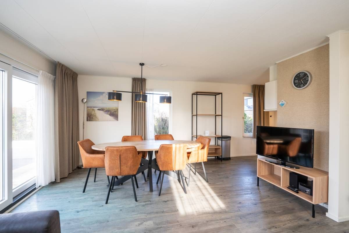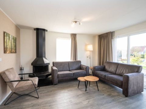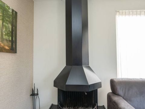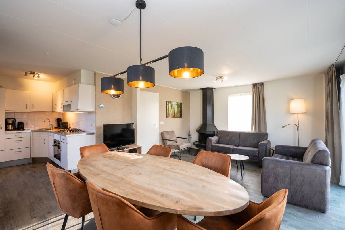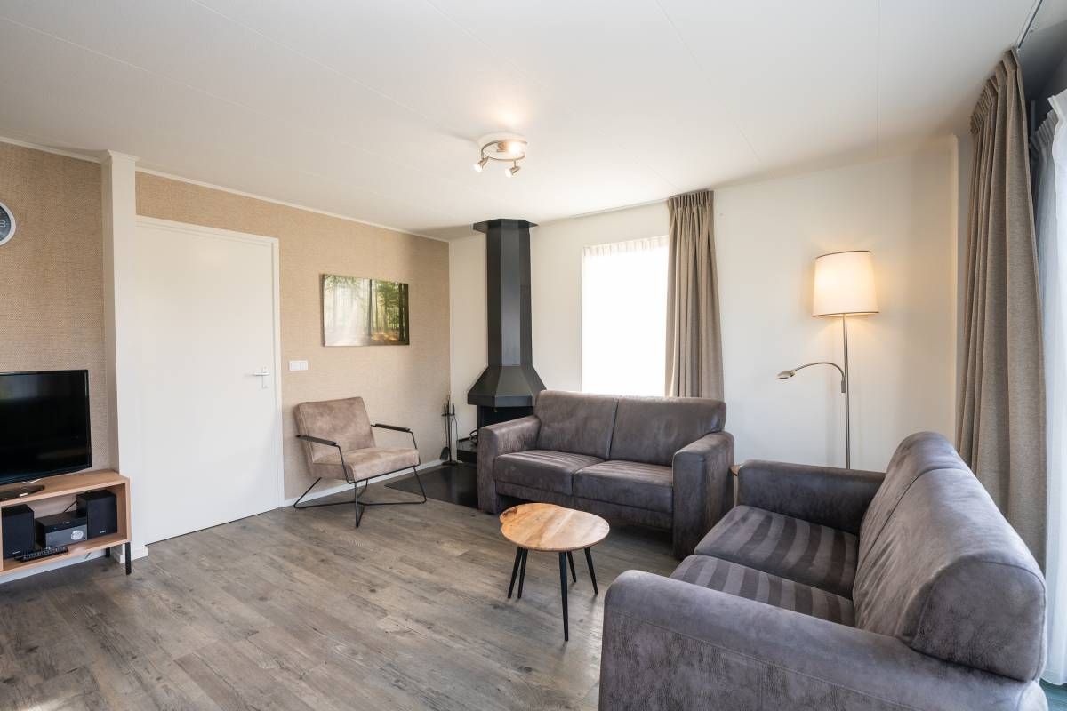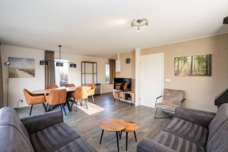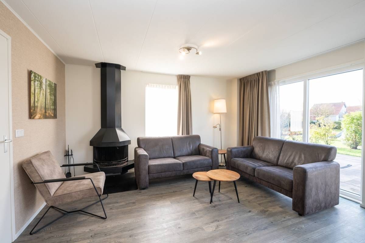 De woonkamer is heerlijk licht dankzij grote raampartijen en de schuifpui naar het zonovergoten terras en de omringende tuin. De sfeervolle zithoek is voorzien van een gezellige open haard, ideaal op koelere dagen. De ruimte is verzorgd ingericht, waar door u direct een warm en ontspannen vakantiegevoel ervaart.