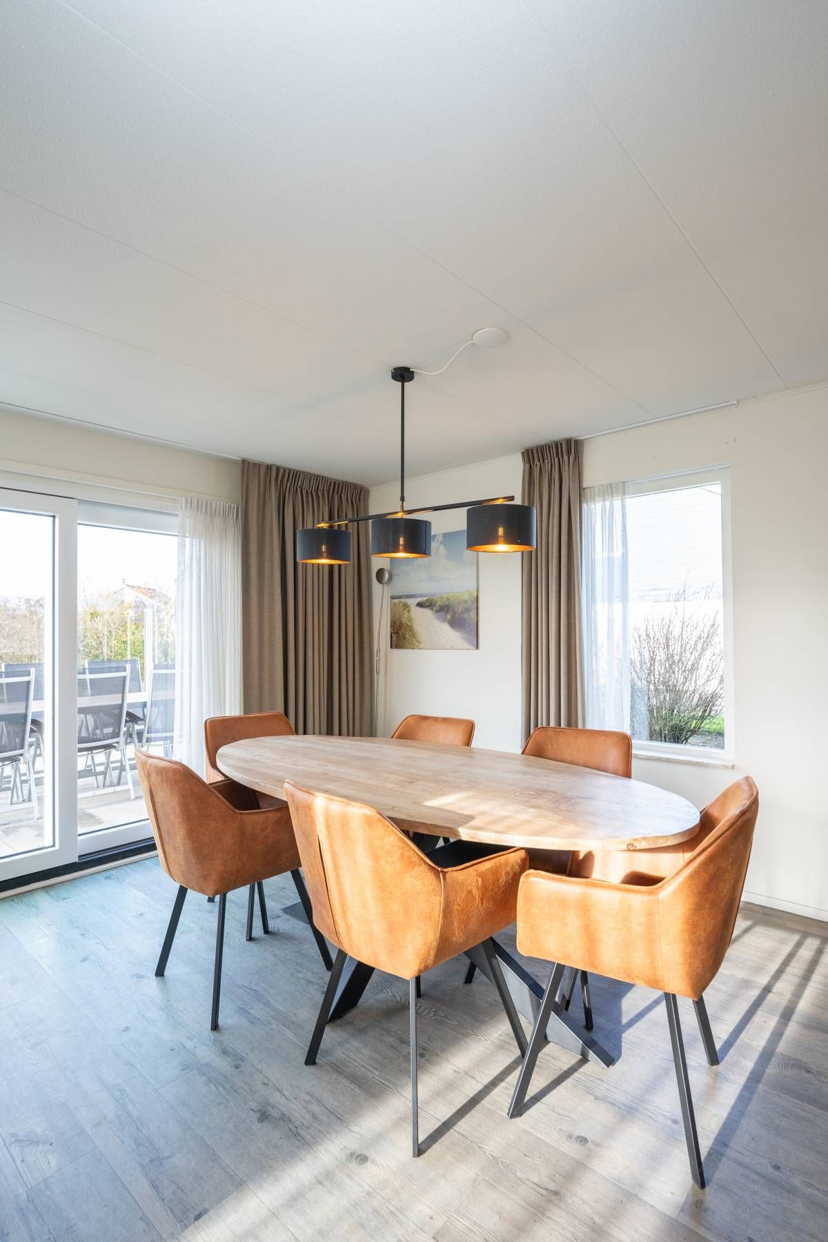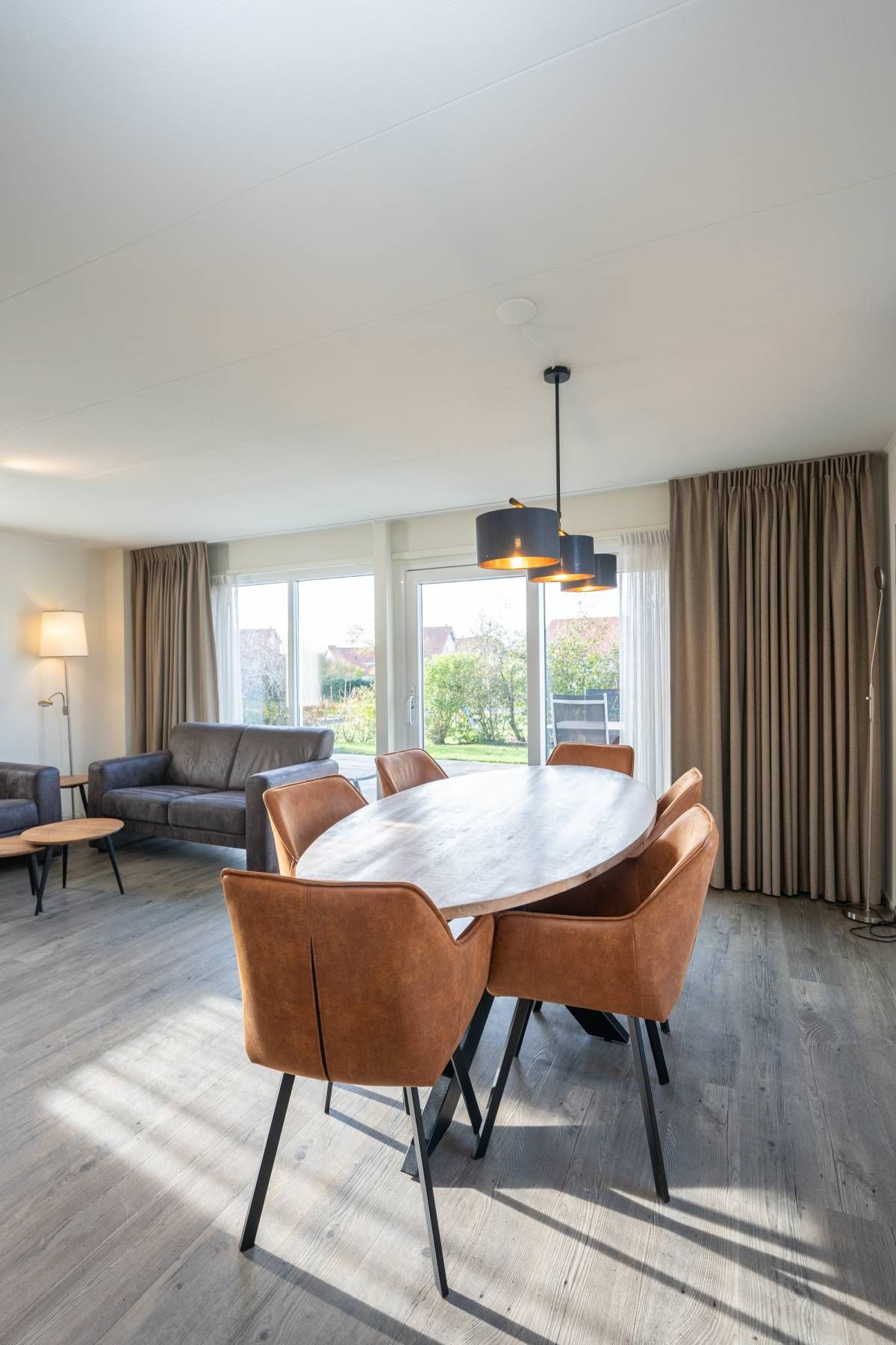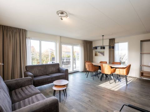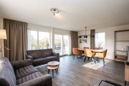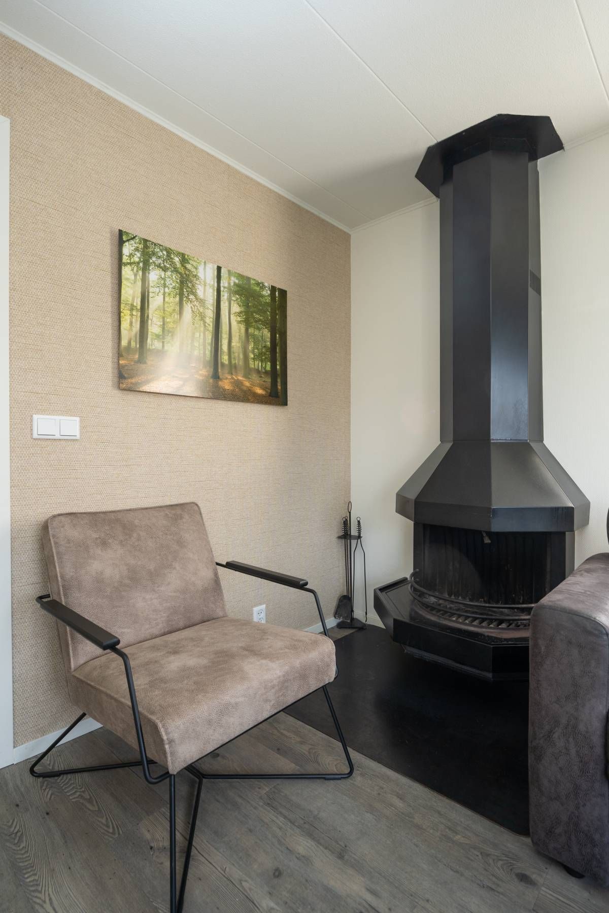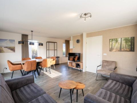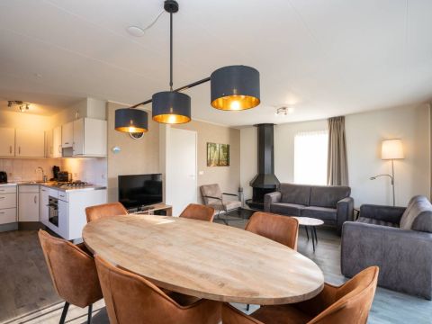 De woonkamer is heerlijk licht dankzij grote raampartijen en de schuifpui naar het zonovergoten terras en de omringende tuin. De sfeervolle zithoek is voorzien van een gezellige open haard, ideaal op koelere dagen. De ruimte is verzorgd ingericht, waar door u direct een warm en ontspannen vakantiegevoel ervaart.