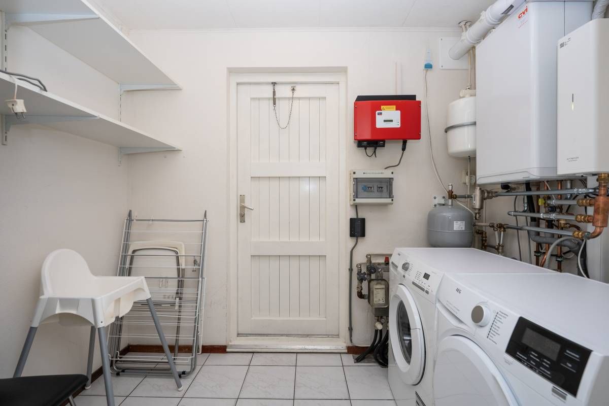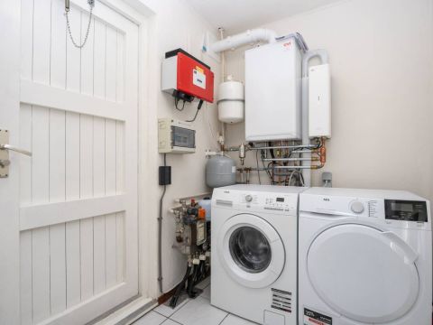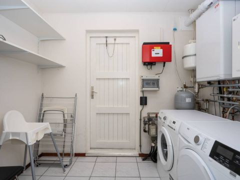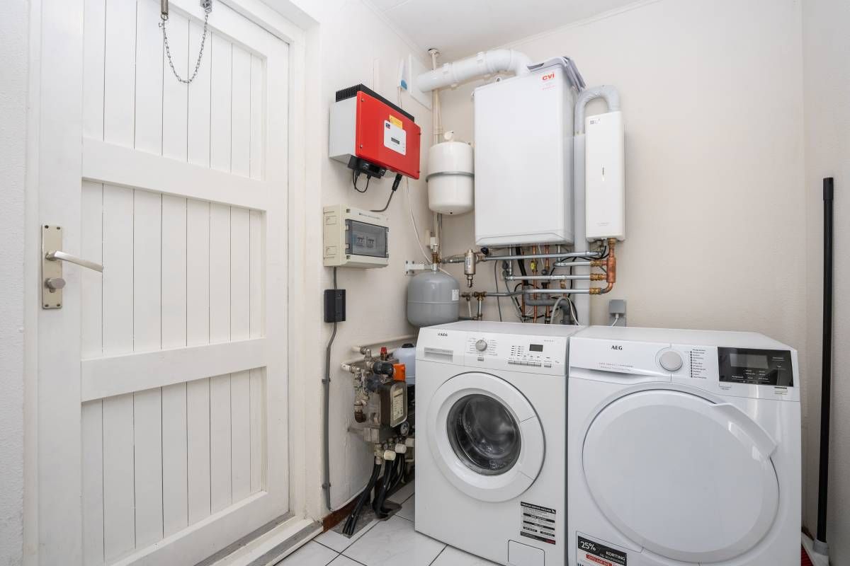 In de berging bevindt zich de opstelplaats voor de wasmachine, droger en de HR-ketel. In 2024 is hier een nieuwe ketel met hybride warmtepomp geplaatst, wat de woning energiezuiniger en toekomstbestendiger maakt.