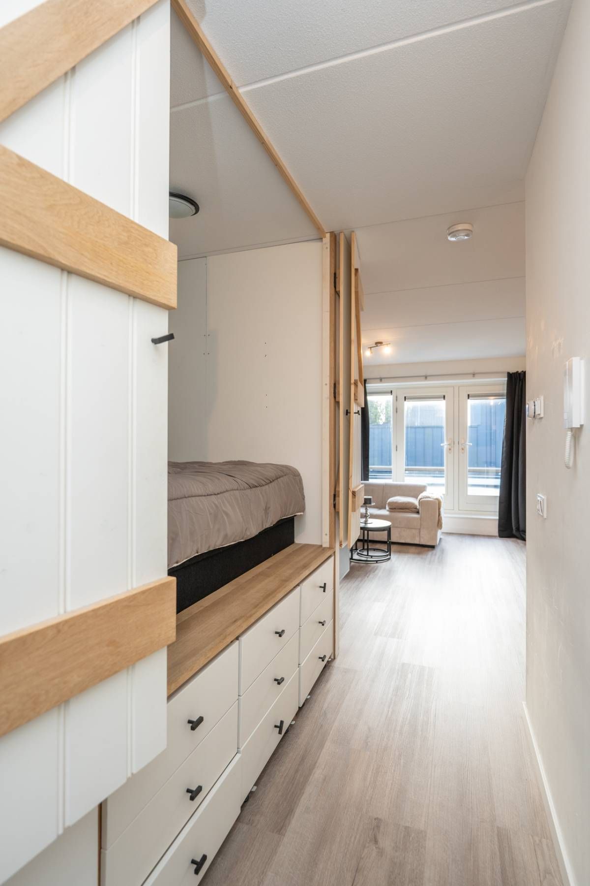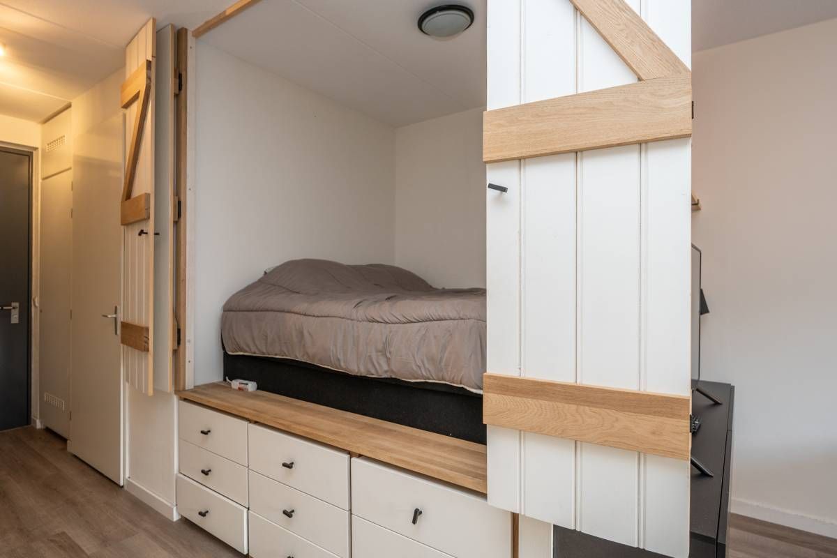 Omdat het een studio betreft, is er slim gebruikgemaakt van de ruimte. De charmante bedstede zorgt voor een knusse slaapplaats en biedt daaronder meerdere lades, ideaal voor het opbergen van kleding en overige spullen.