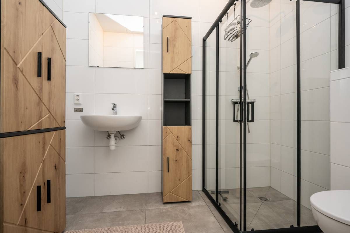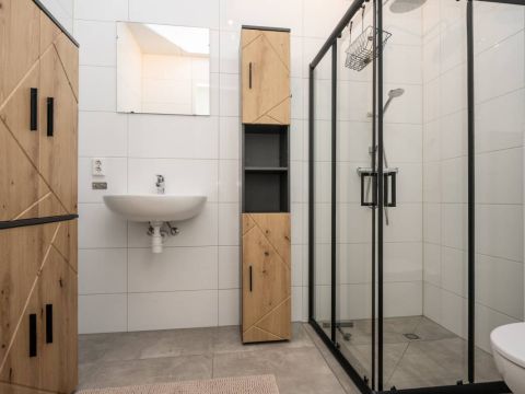 De complete badkamer beschikt over een inloopdouche, wastafel en toilet.
