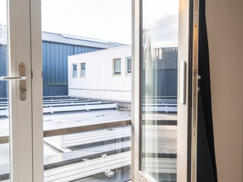 Via openslaande deuren kijk je uit op het platte dak, waardoor er volop daglicht binnenvalt.