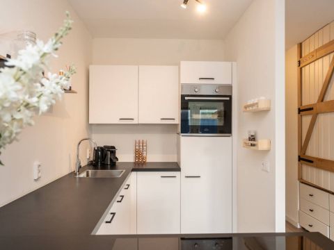 De moderne keuken is voorzien van diverse luxe inbouwapparatuur, waaronder een kookplaat met ingebouwde afzuiging, oven en voldoende kastruimte. Daarnaast is er aan het keukenblad een leuk barretje gecreëerd.