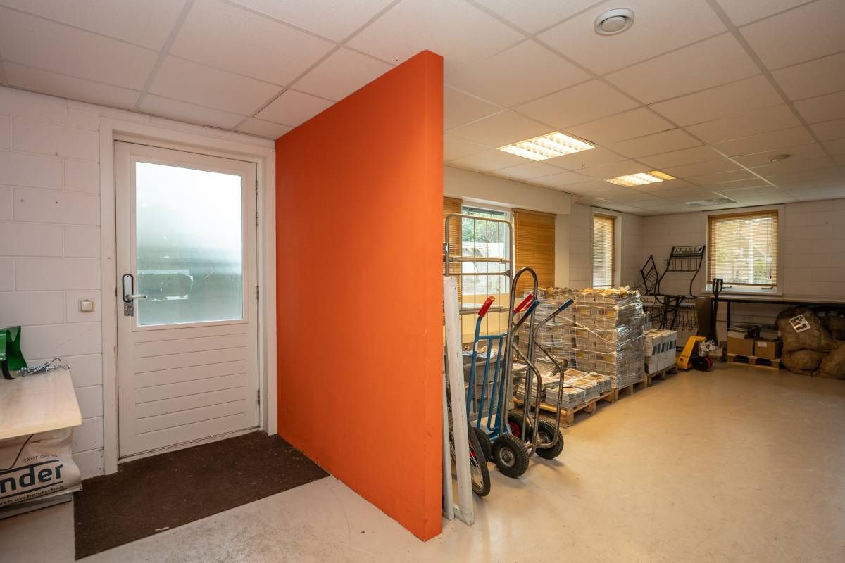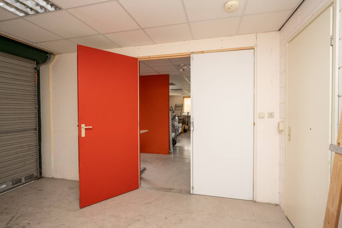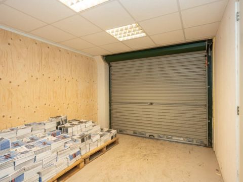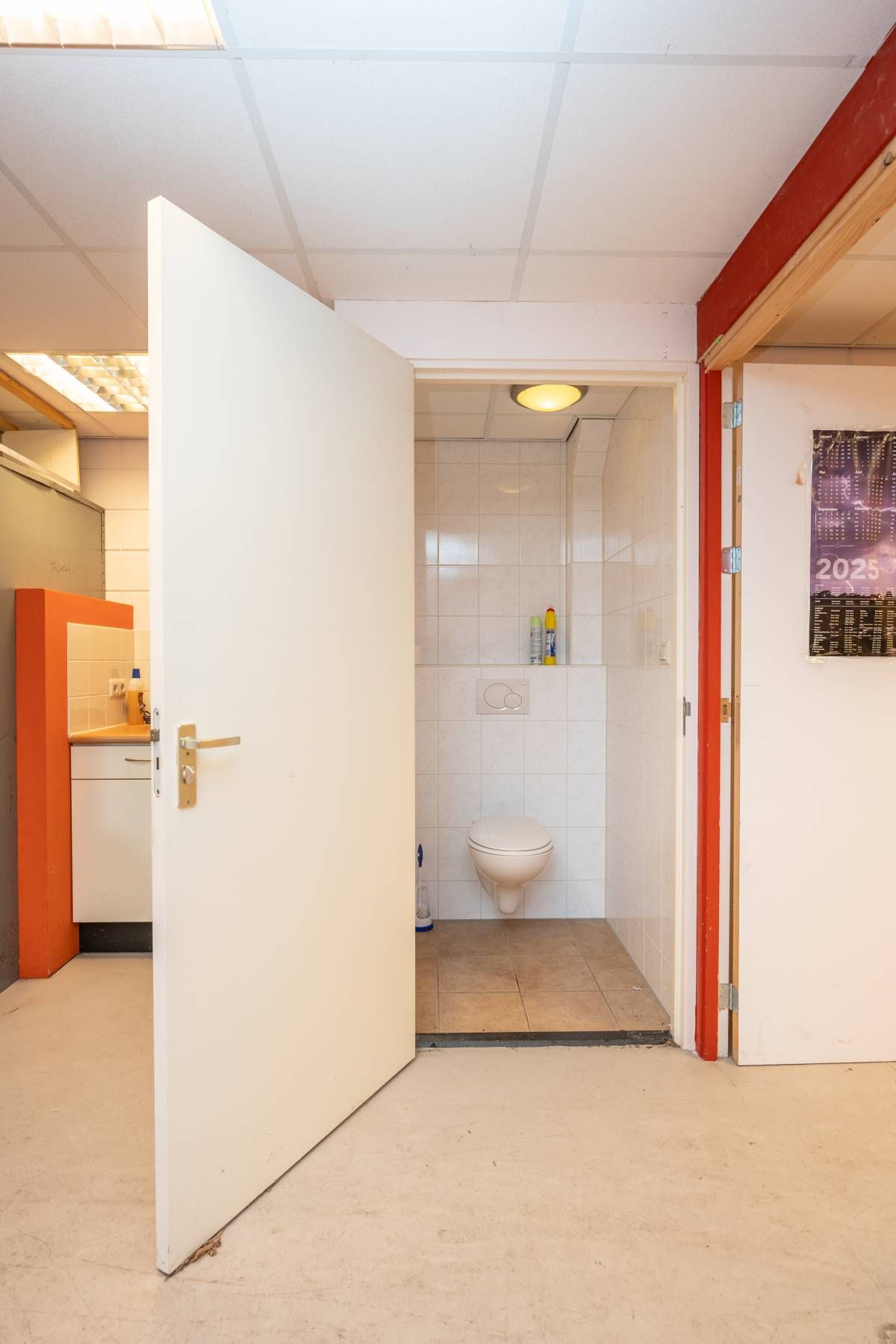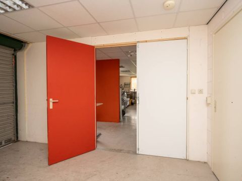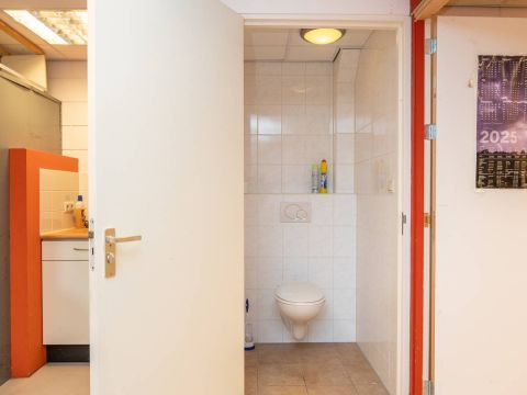 Via de straatzijde komt u binnen door de loopdeur in een ruimte van ca. 60 m², tevens bereikbaar via een roldeur. De ruimte is optisch verdeeld in drie delen, maar grote doorgangen en dubbele deuren verbinden alles tot één geheel. Bij binnenkomst treft u een open ruimte met pantry en toilet. Aan de rechterzijde leiden dubbele deuren naar het gedeelte met de roldeur en aan de linkerzijde bevindt zich een grote open ruimte, momenteel in gebruik als opslag. Vanuit de hal van de bovenwoning is er ook toegang tot een separate berging, die via de begane grond bereikbaar is. Twee extra deuren (zijkant en achterkant) bieden extra toegang tot de hal.