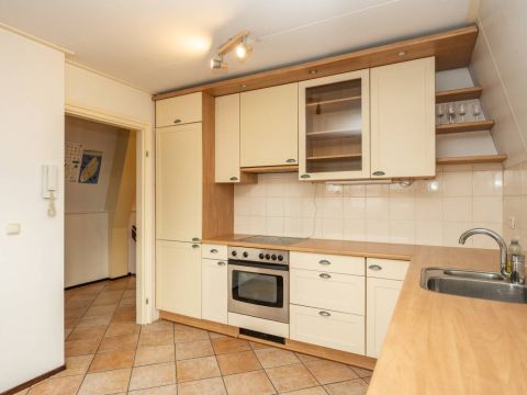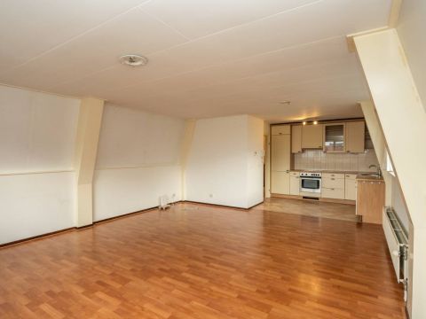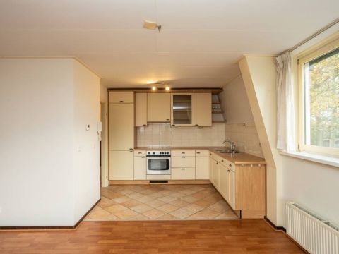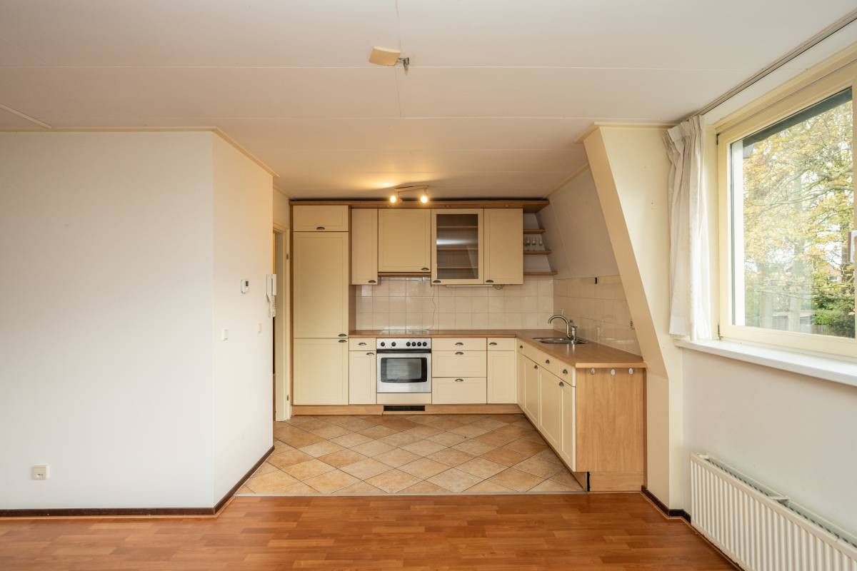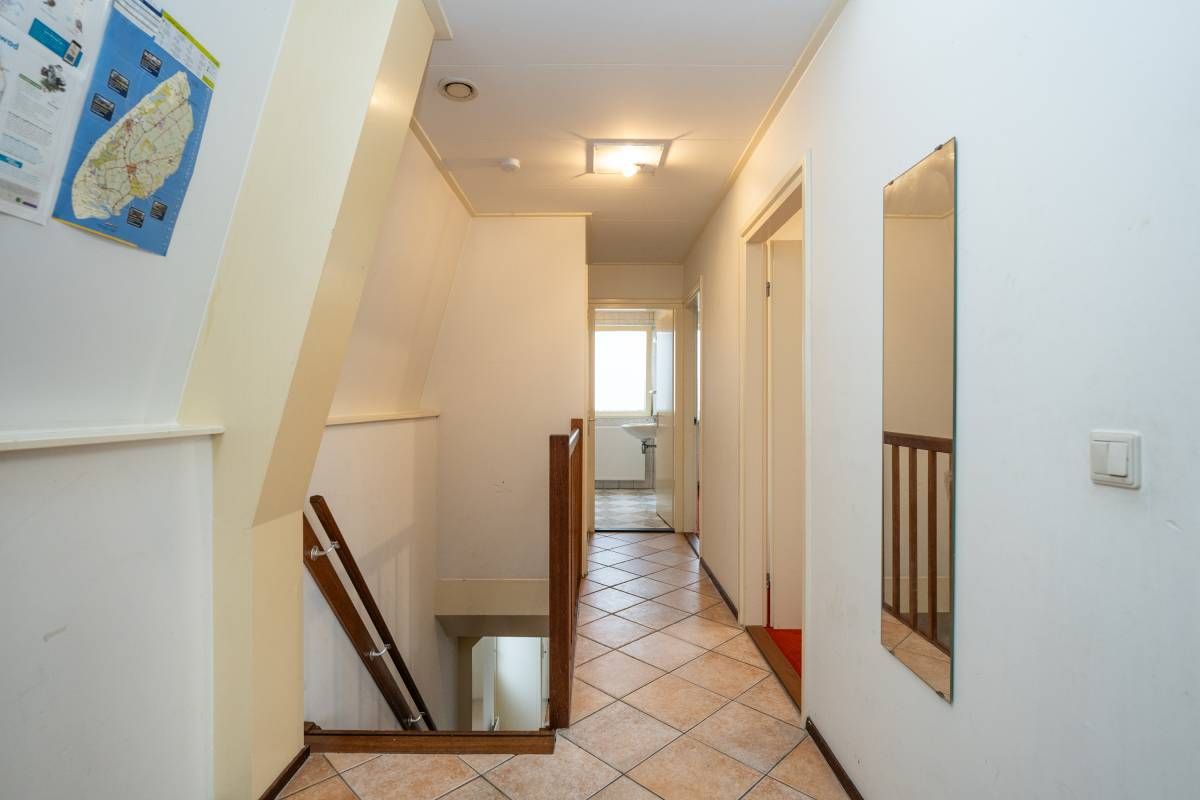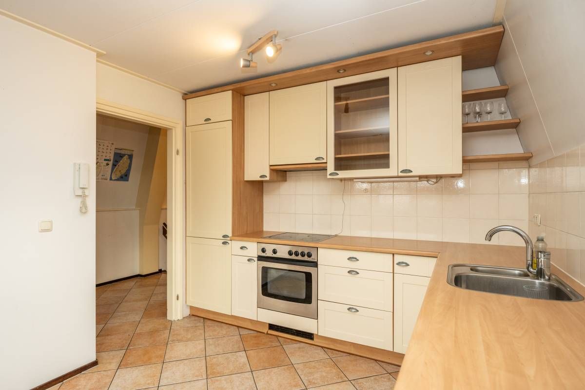 Via de trap in de hal komt u op de bovenverdieping, waar een lichte halfopen keuken met alle voorzieningen aansluit op een ruime woonkamer met veel daglicht en een leuk uitzicht op het dorp.
