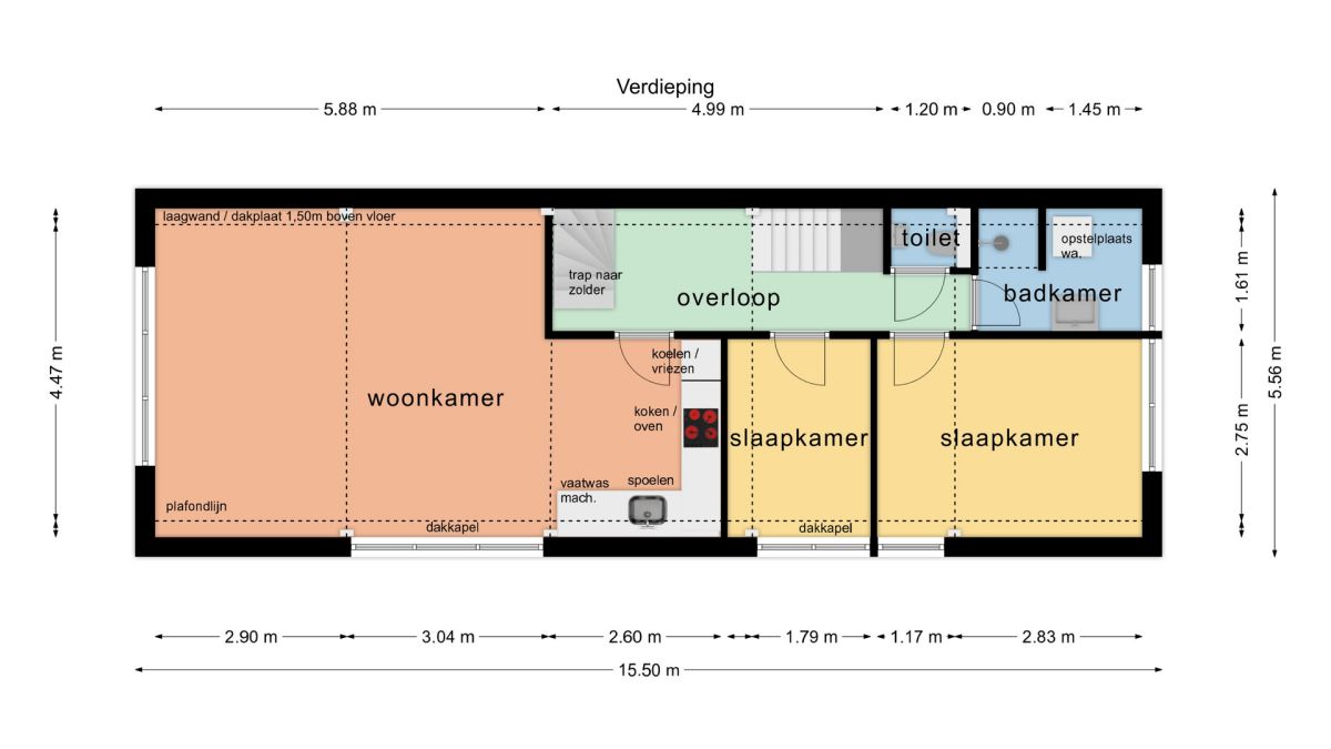 Overig 1e verdieping | Overloop met trapopgang, woonkamer, keuken, 2 slaapkamers, toilet, badkamer. |