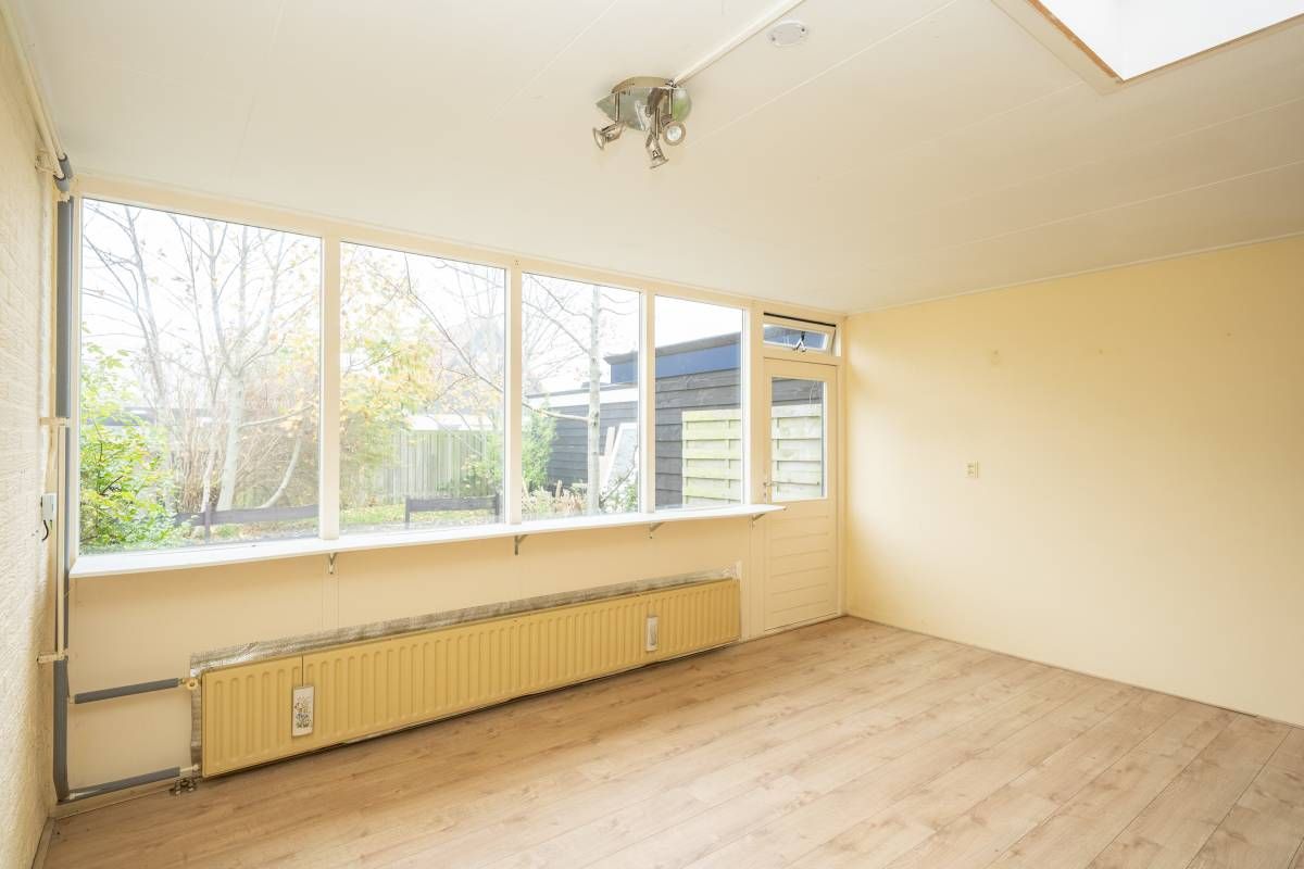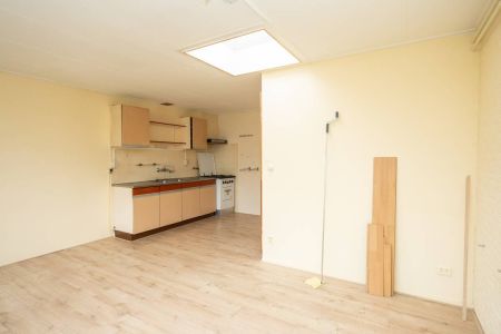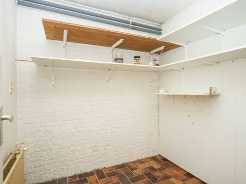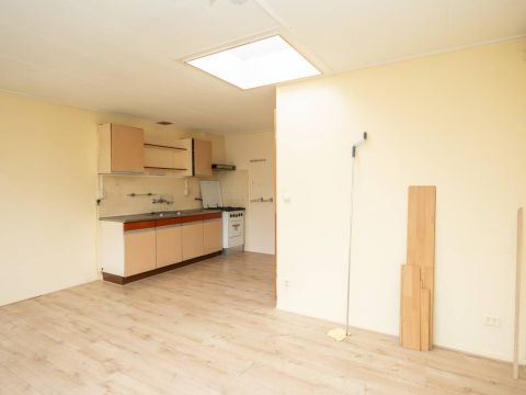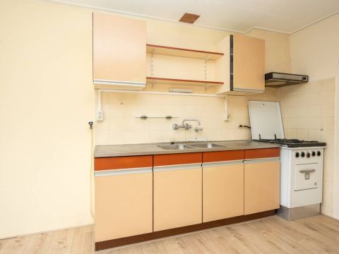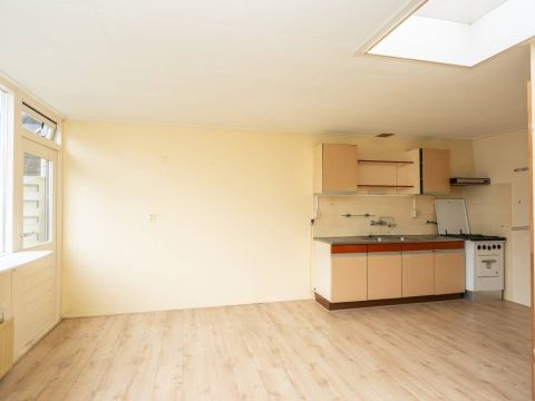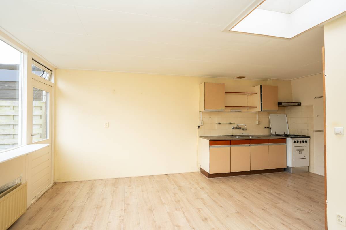 De ruime woonkamer is voorzien van een nette laminaatvloer en heeft een eenvoudig keukenblok. Via de keuken is de aansluitende inpandige berging bereikbaar.