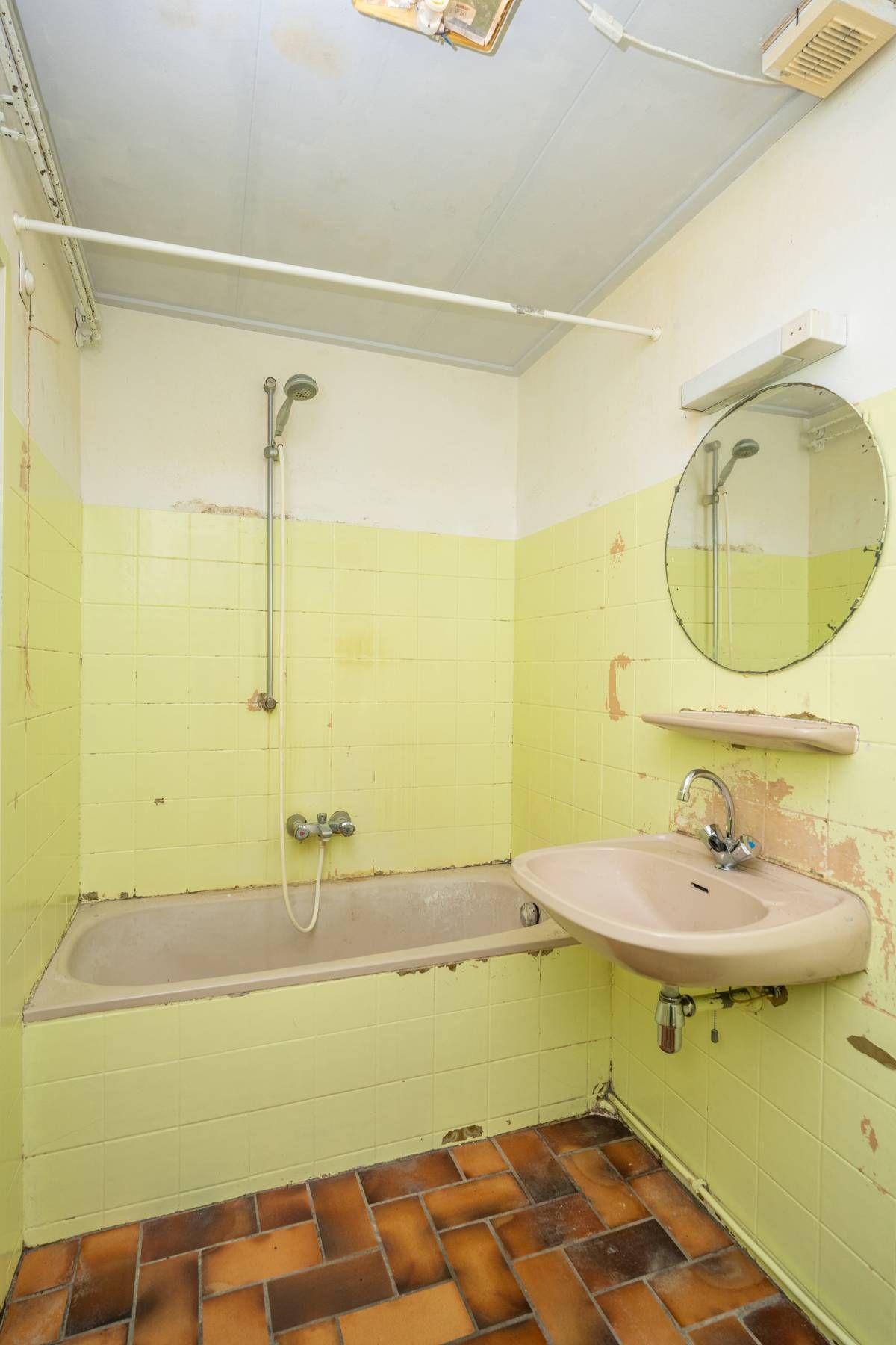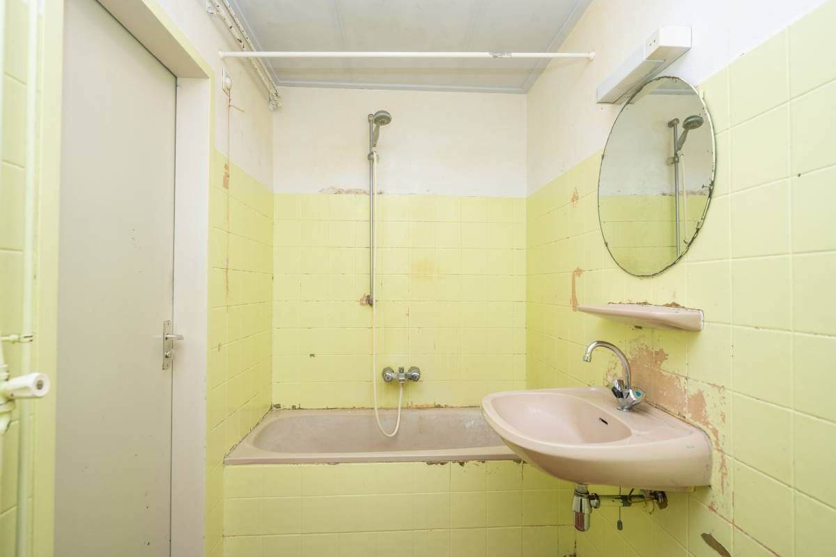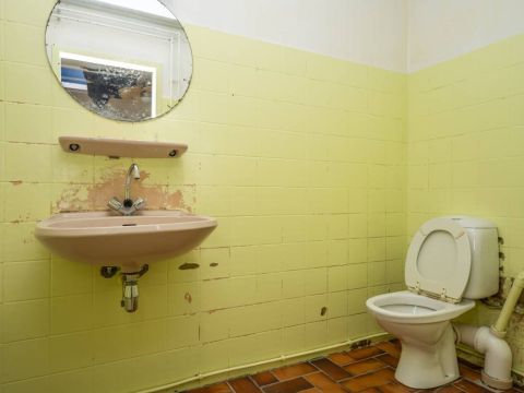 Deze ruimte is toe aan een flinke make-over. Hier bevindt zich ook de aansluiting voor de wasmachine.