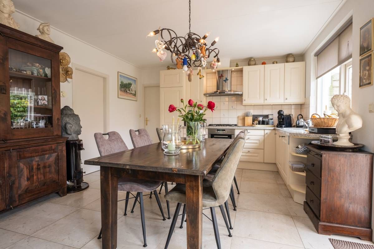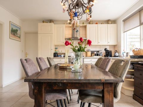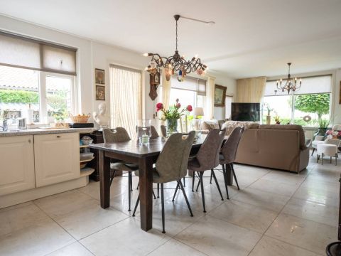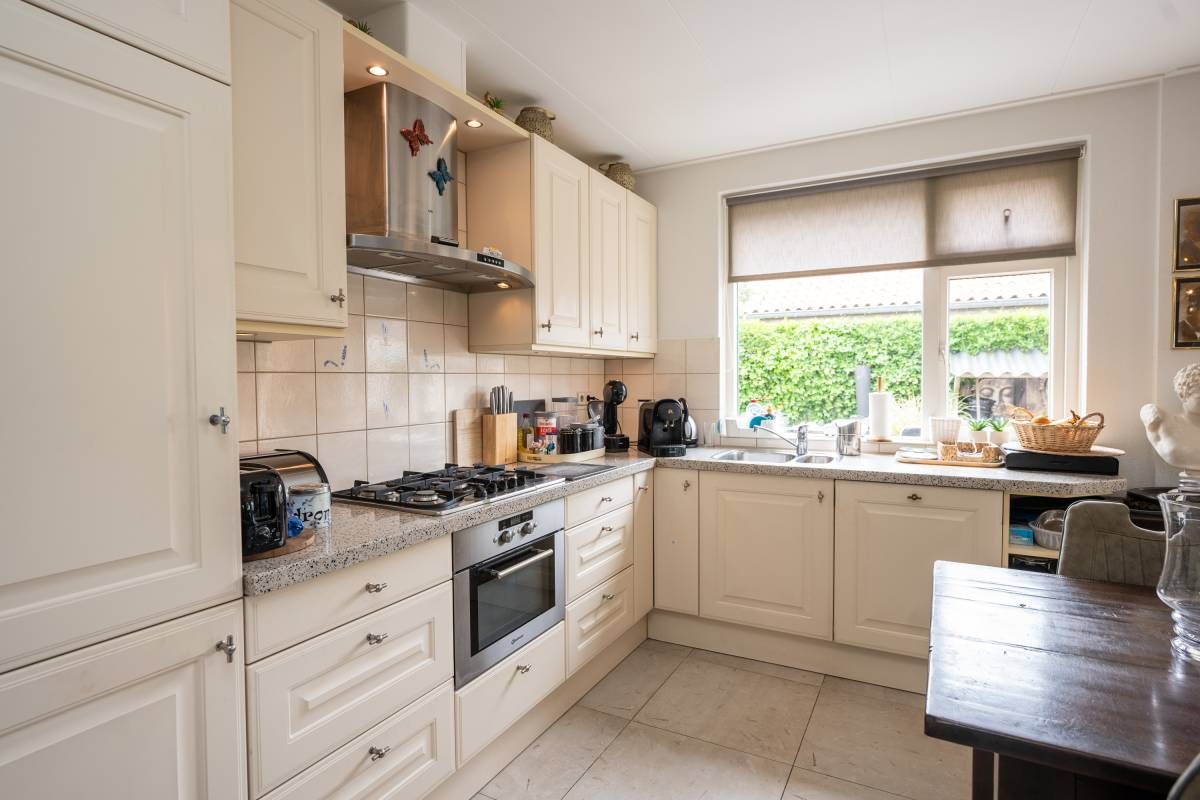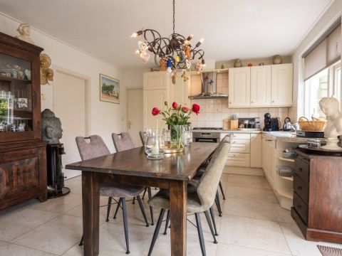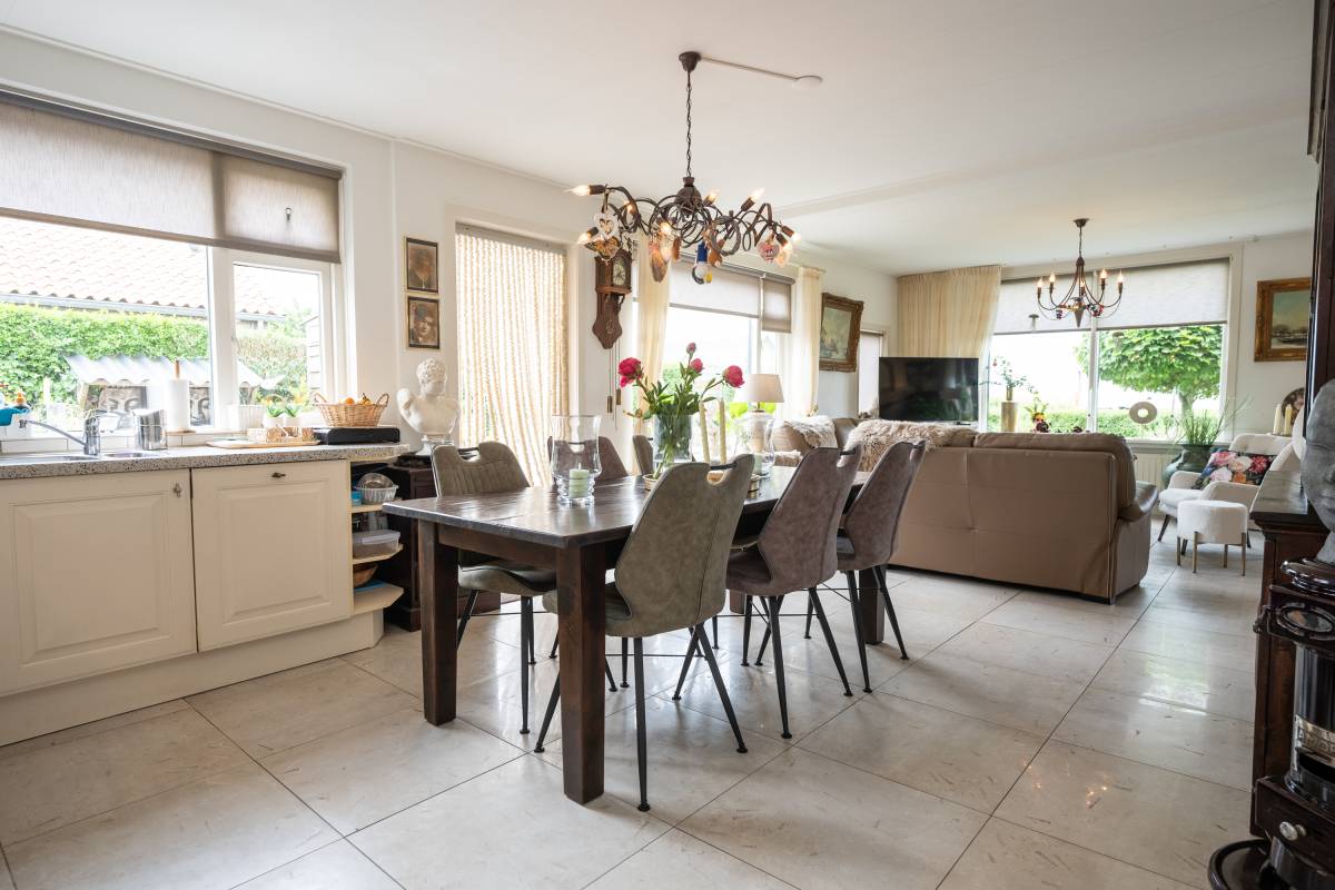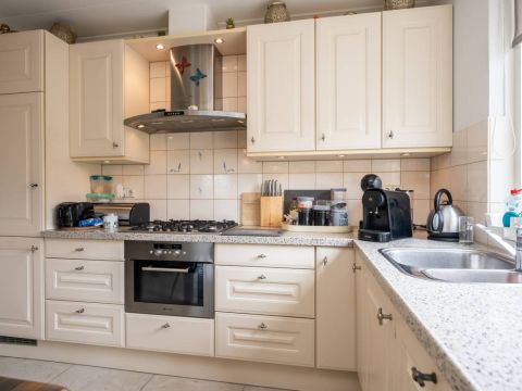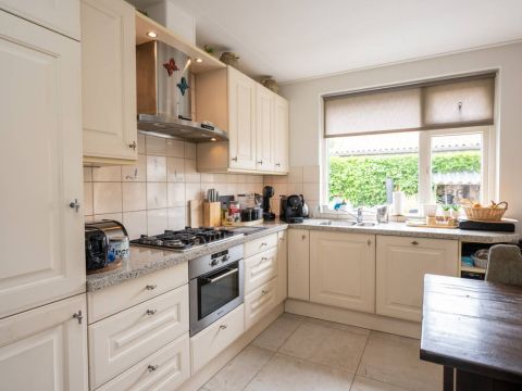 Direct aansluitend aan de woonkamer bevindt zich de royale woonkeuken. De keuken is van alle luxe gemakken voorzien waar onder een vaatwasmachine, gaskookplaat, afzuigkap en koel/vriescombinatie.
