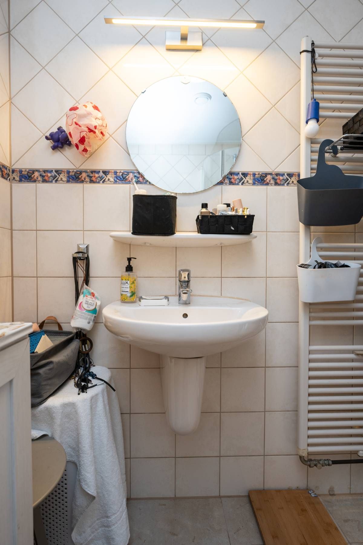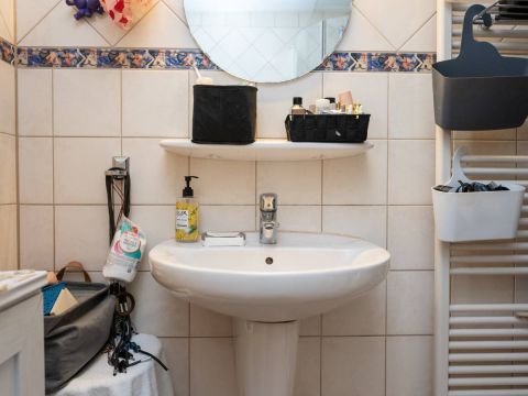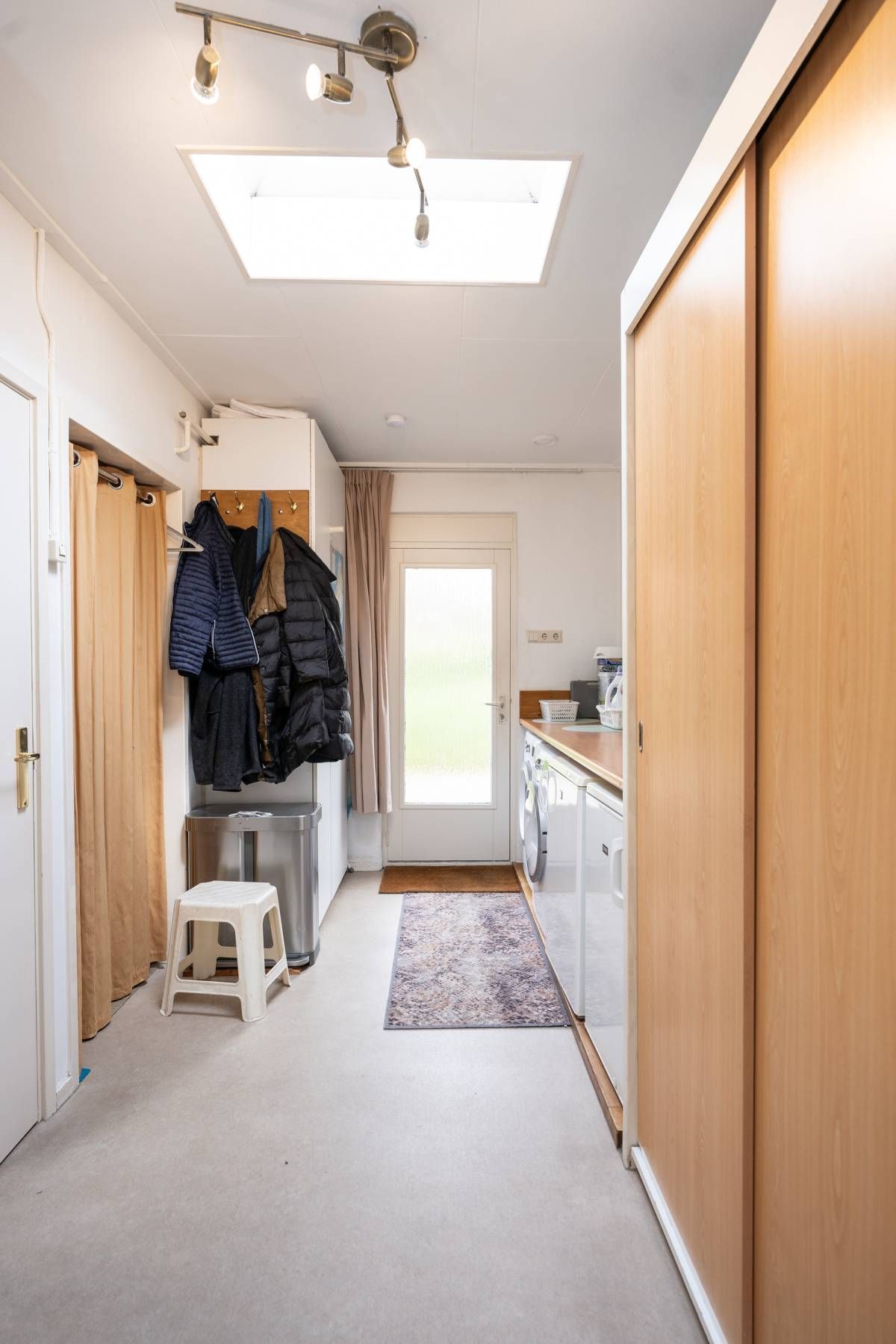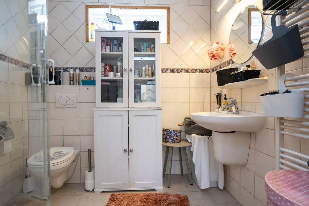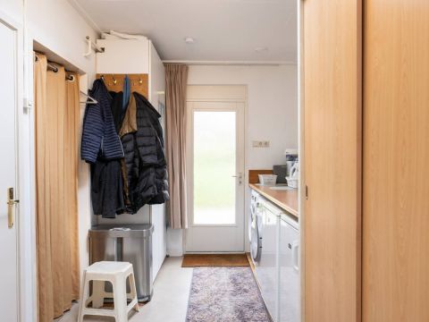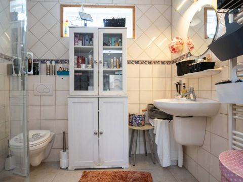 Vanuit de keuken doorloop naar de berging. In de berging treft u de opstelplaats voor de wasmachine en droger. Middels de lichtkoepel heeft u ook hier een fijne lichtinval. Via de berging heeft u ook toegang tot de badkamer. De badkamer beschikt over een douche, wastafel en toilet.