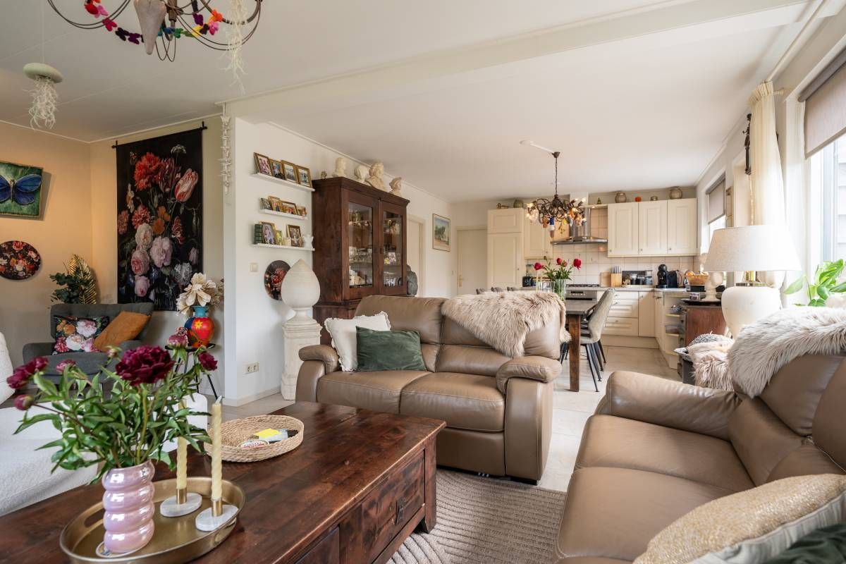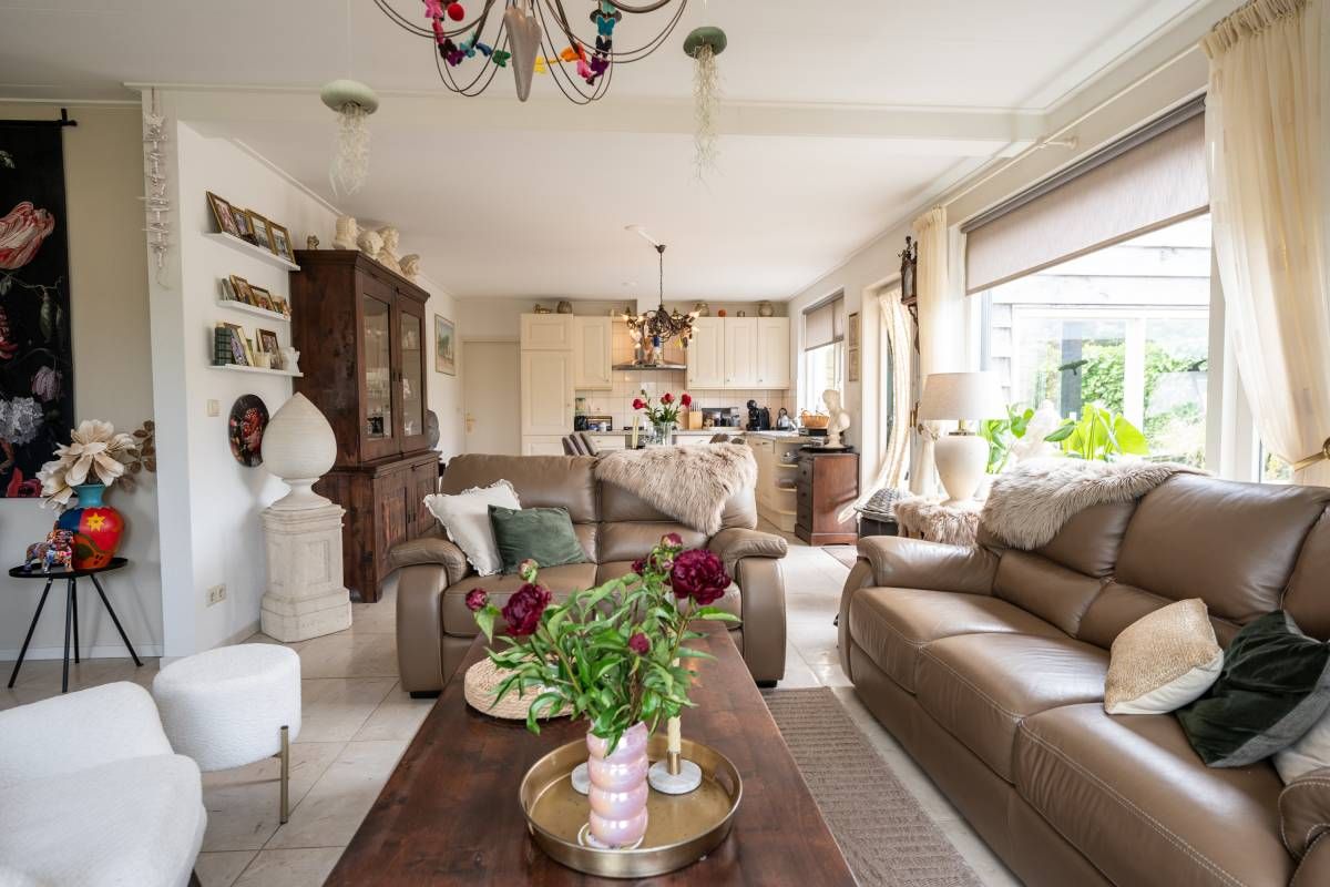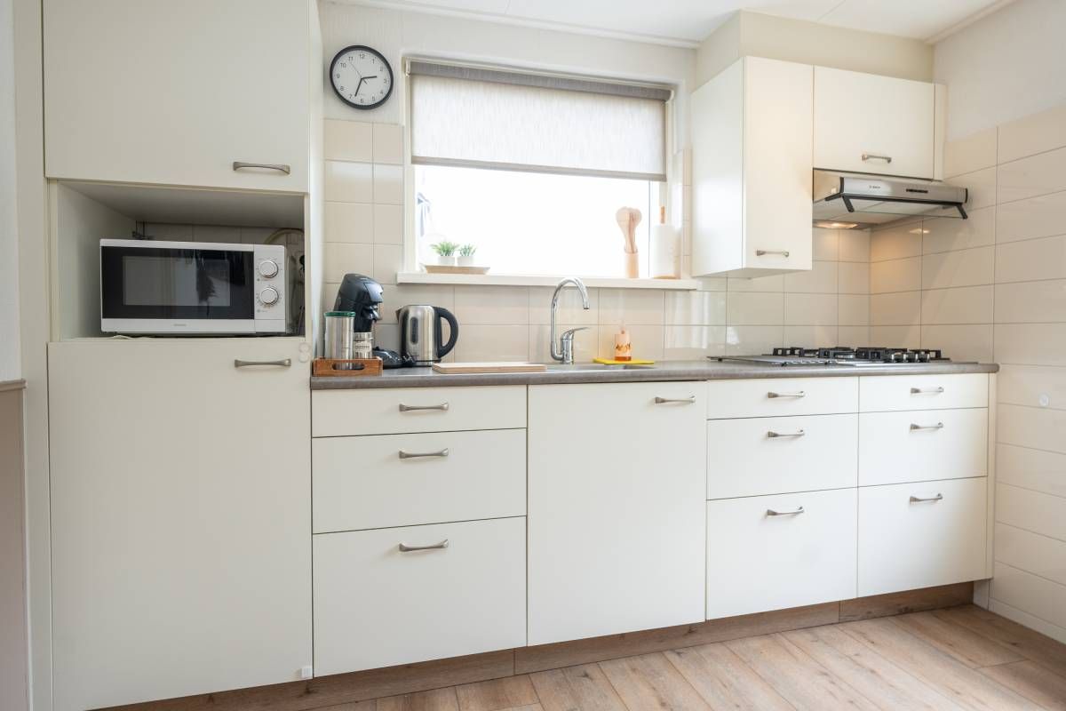Ook deze woonkamer is heerlijk licht en smaakvol ingericht. De keuken beschikt over diverse gemakkelijk om een heerlijke maaltijd te bereiden.