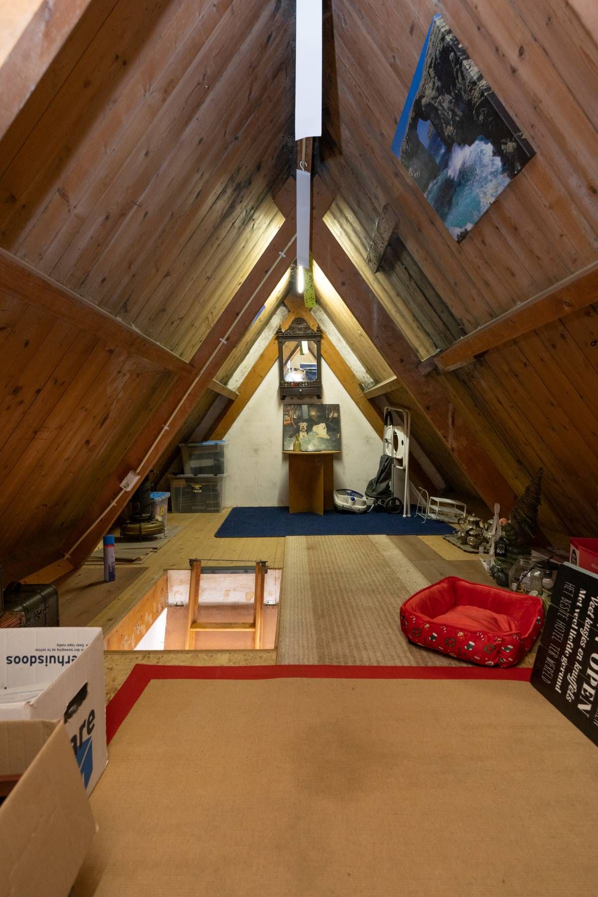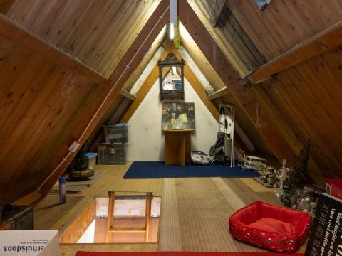 De bergzolder is bereikbaar via de vlizotrap op de overloop. Een ideale ruimte welke gebruikt kan worden als extra opbergruimte.