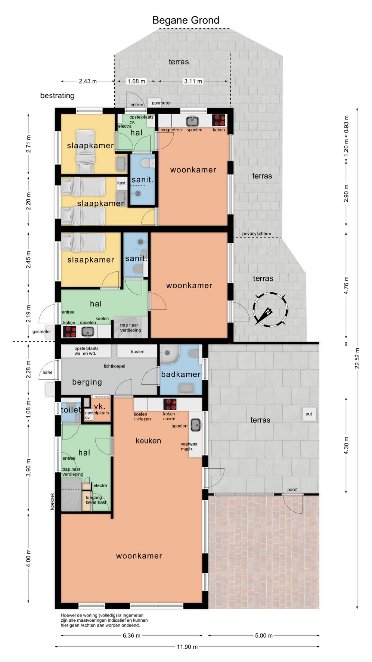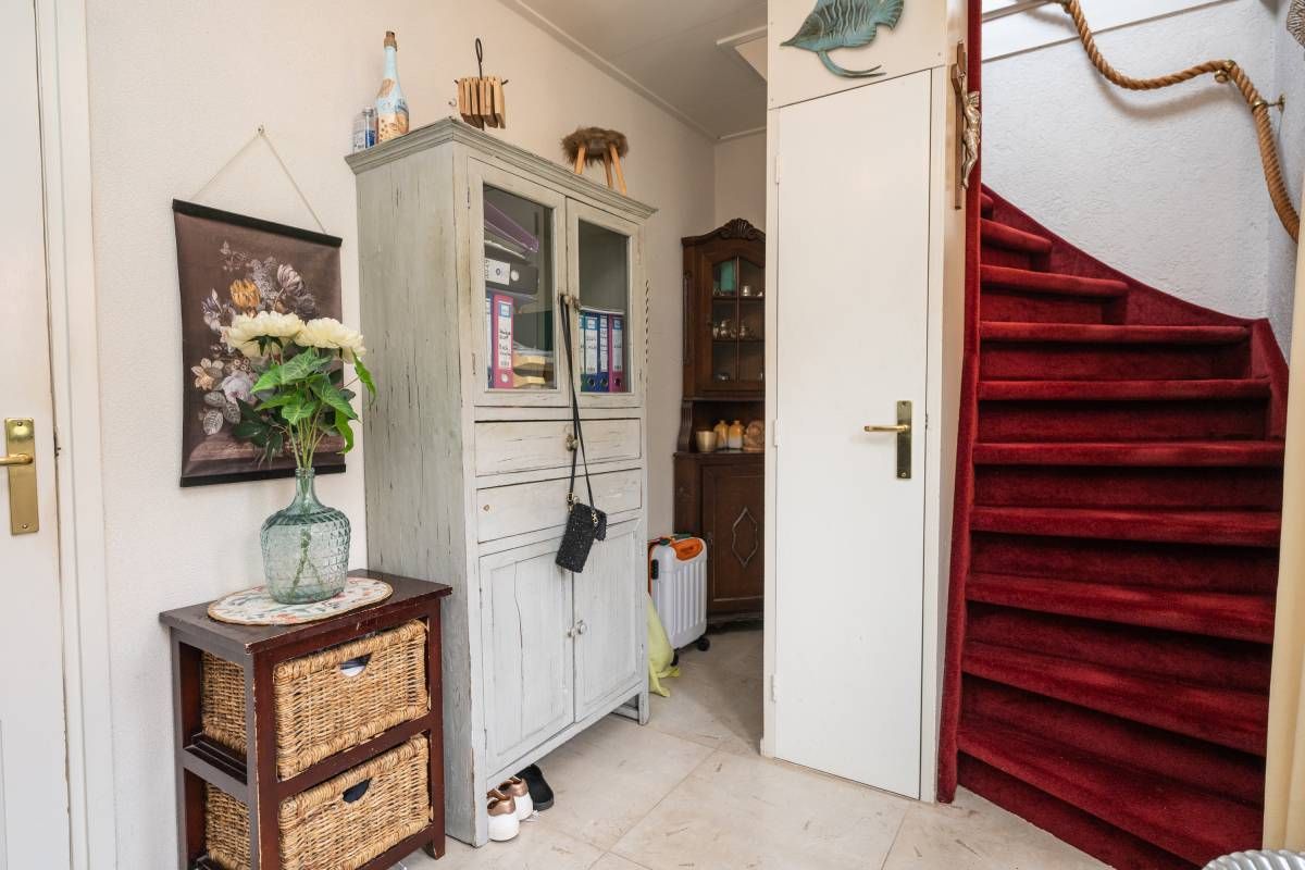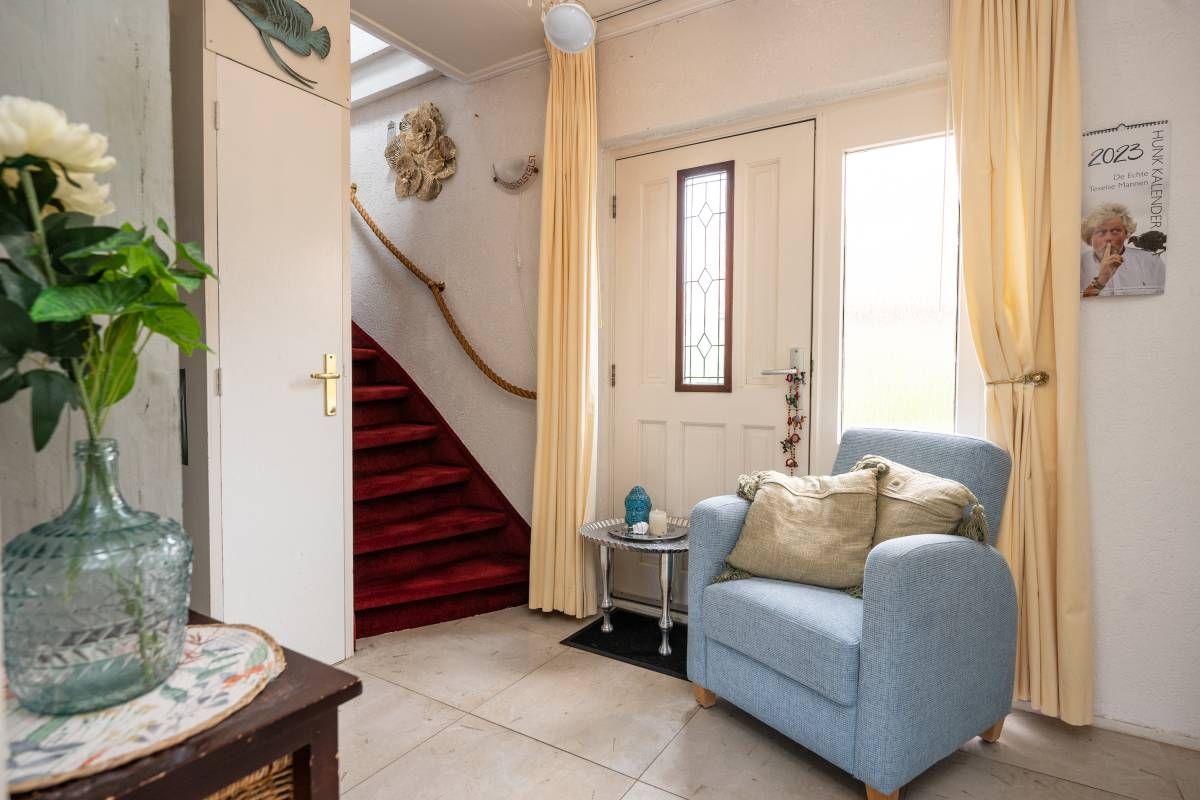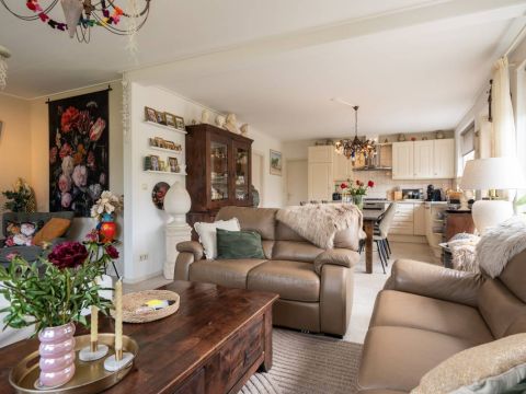 Indeling: Via de voordeur betreedt u de centrale hal met toegang tot de woonkamer, keuken, toilet, trapopgang naar de verdieping en meterkast. De woonkamer is royaal van opzet en heerlijk licht dankzij de grote raampartijen.