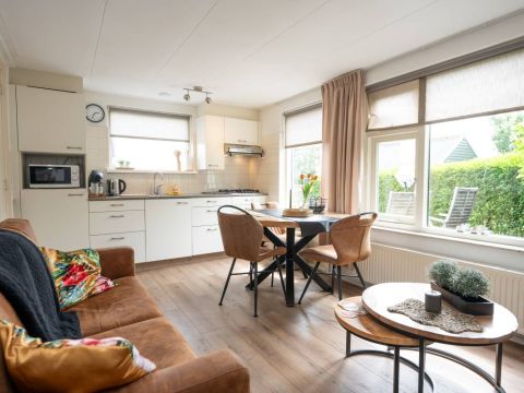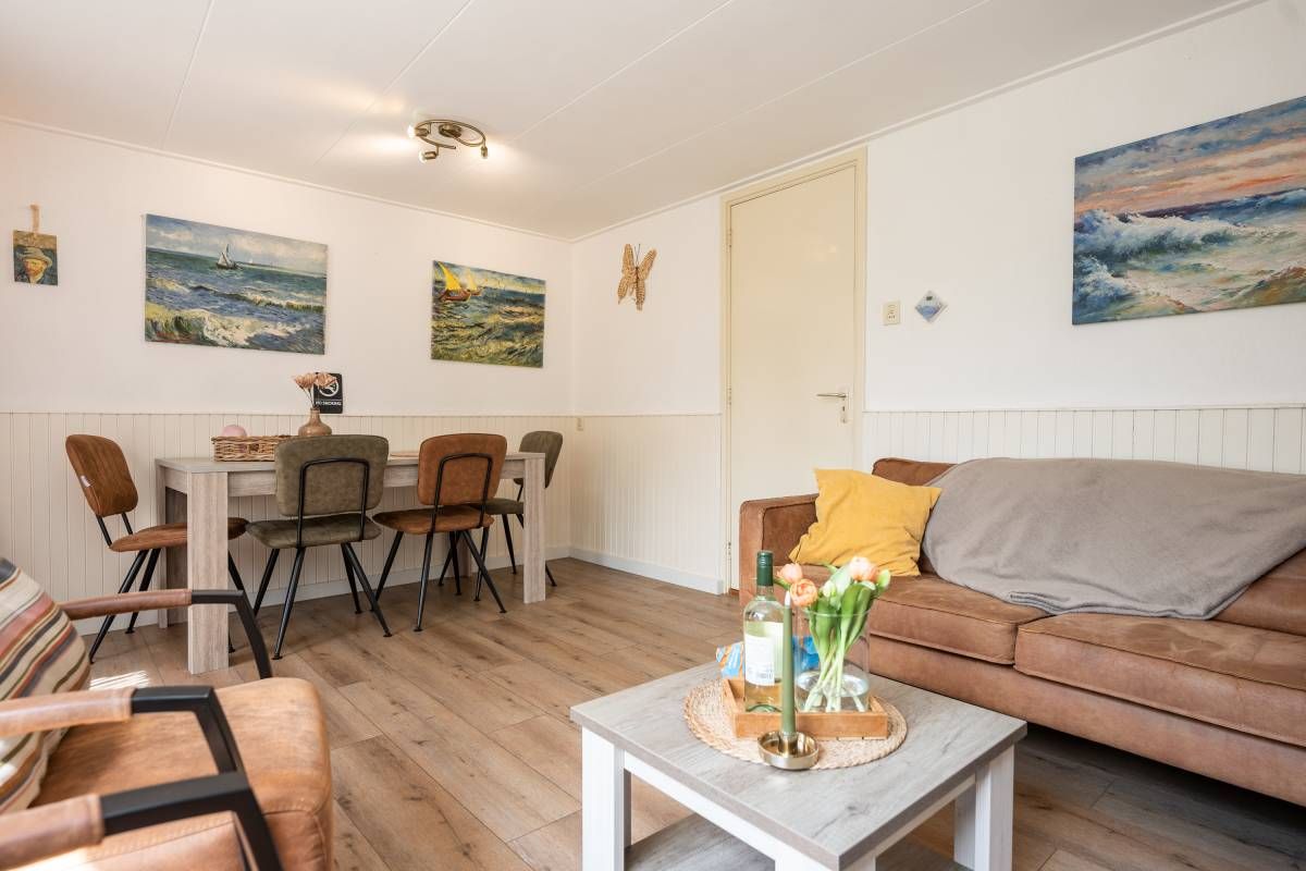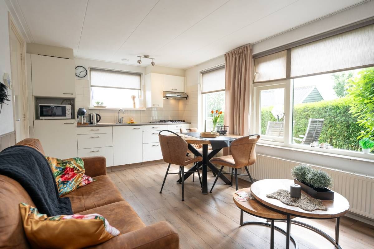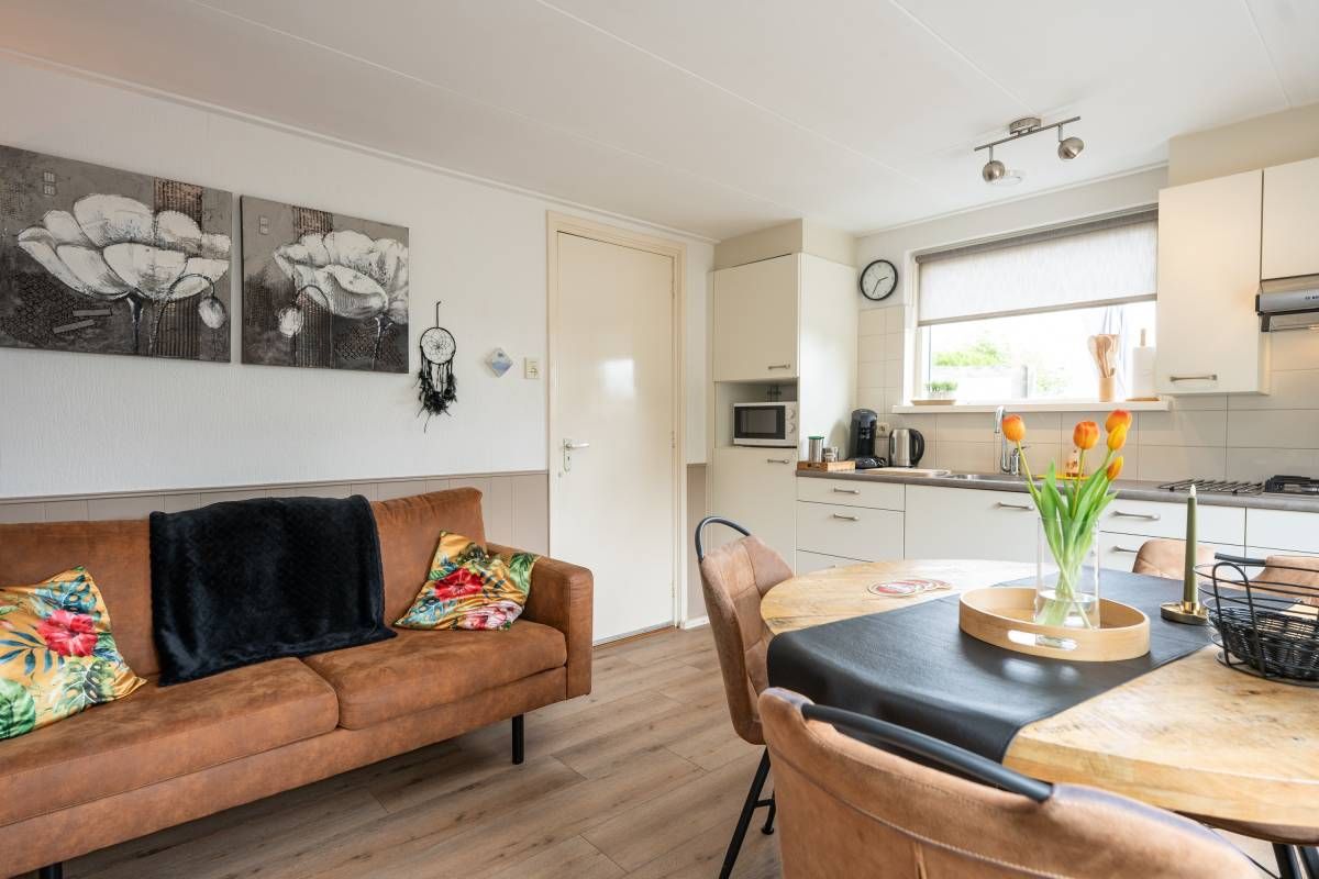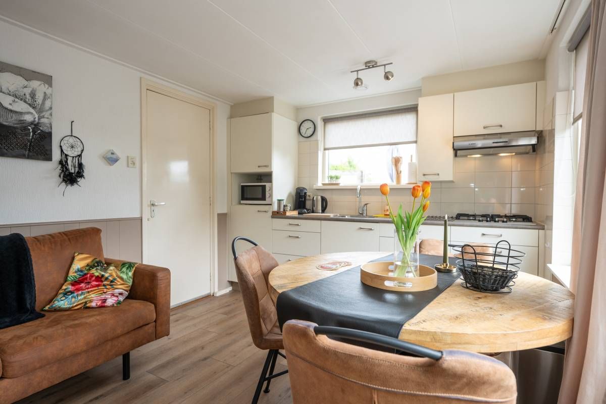 Recreatiewoning II | De tweede recreatiewoning is eveneens aantrekkelijk en klaar voor een heerlijk verblijf. De indeling is compact maar efficiënt: via de hal/entree betreed u een gezellige woonkamer met open keuken, waar u direct het warme, uitnodigende karakter van het huisje voelt.