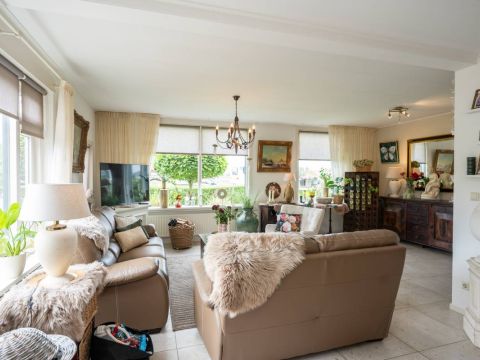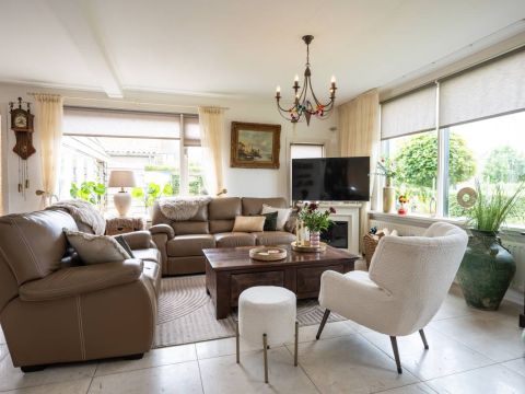 De woonkamer is gesitueerd aan de voorzijde van de woning. De zonnige living is voorzien van een nette plavuizenvloer (voorzien van vloerverwarming).