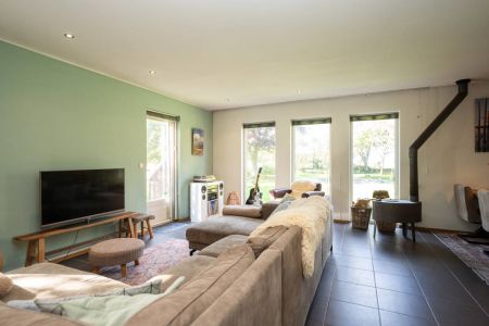 Bij binnenkomst valt direct de lichte en ruime woonkamer op, waar grote raampartijen zorgen voor een overvloed aan daglicht en een schitterend uitzicht over de groene achtertuin. De ruimte ademt gezelligheid, mede dankzij de sfeervolle houtkachel.