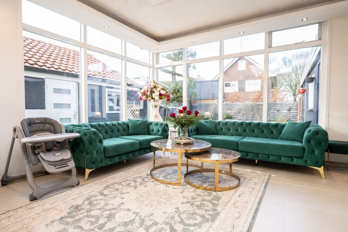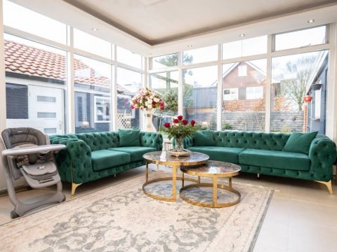 Toegang tot de forse woonkamer met veel lichtinval deze heeft een plavuizen vloer en aansluiting voor een houtkachel.