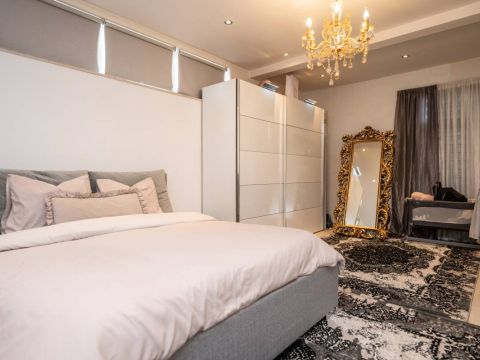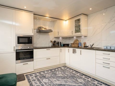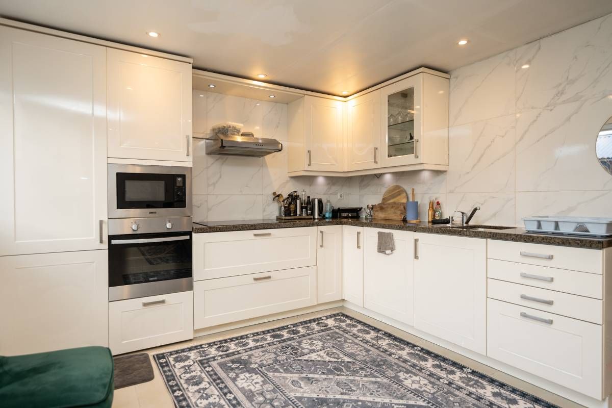 Deze royale eetkeuken biedt vooral veel bergruimte en is uitgerust met een composiet aanrechtblad voorzien van ingebouwde kleine2de wasbak, afwasmachine, inductiekookplaat 90 cm, afzuigkap, Zanussi stoomoven en een Zanussi grill/bakoven.