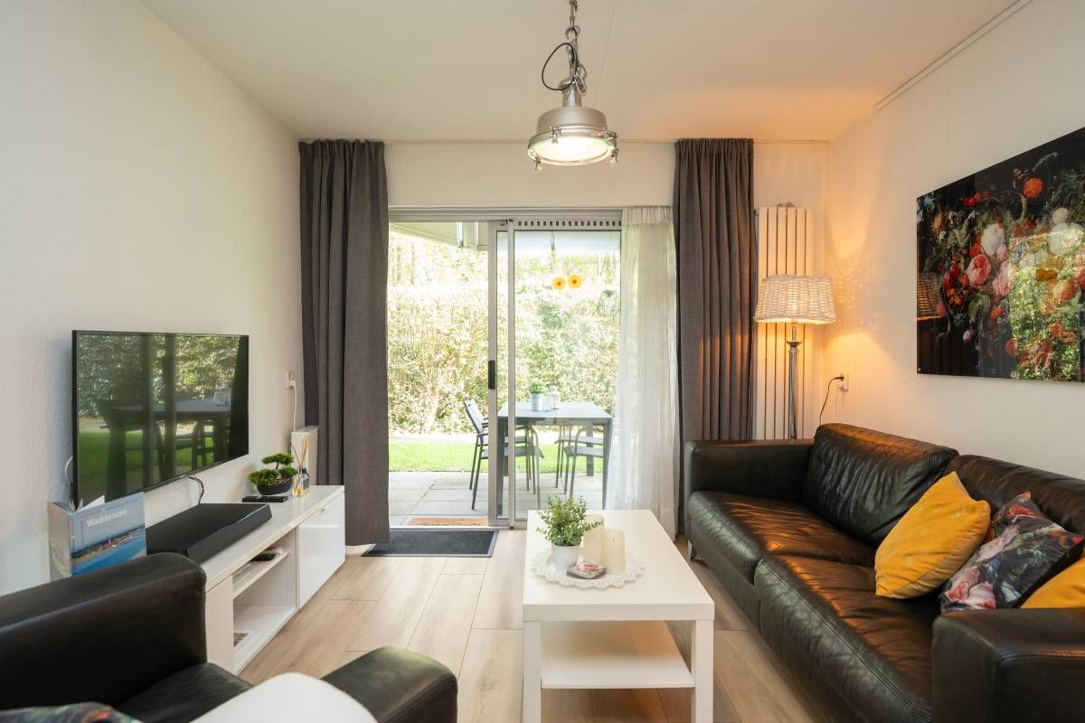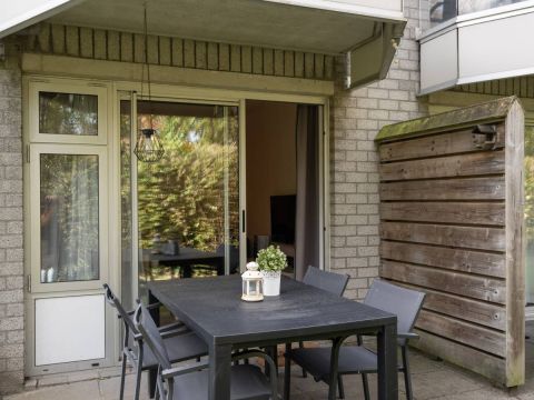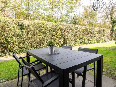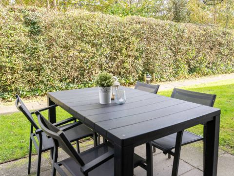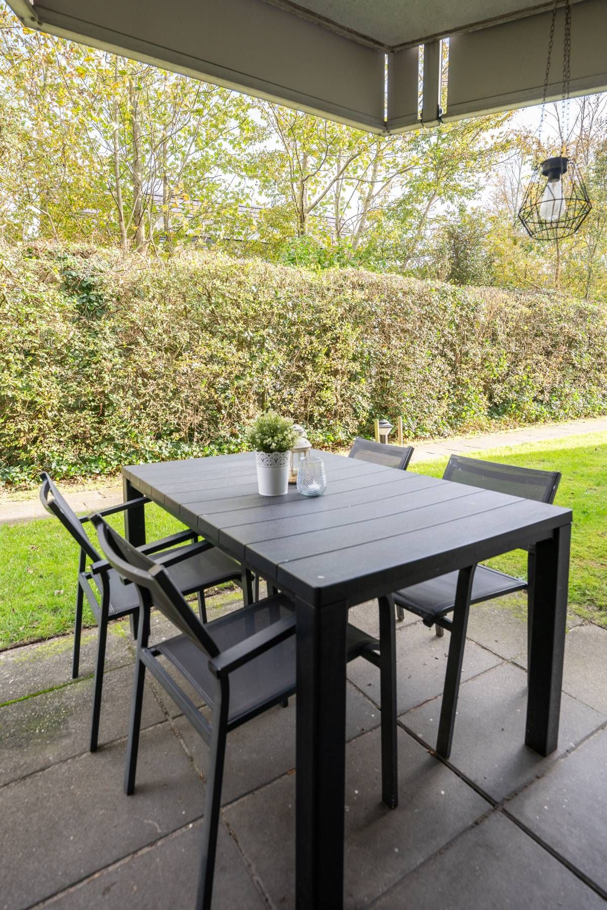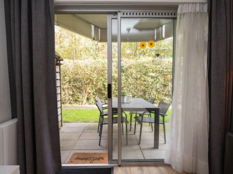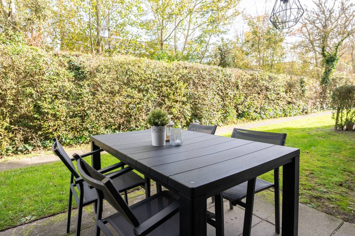 Het terras voelt door de omliggende bosschages heerlijk privé en rustig, een perfecte plek om te ontspannen en te genieten van de frisse Texelse lucht.