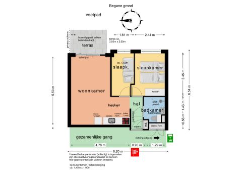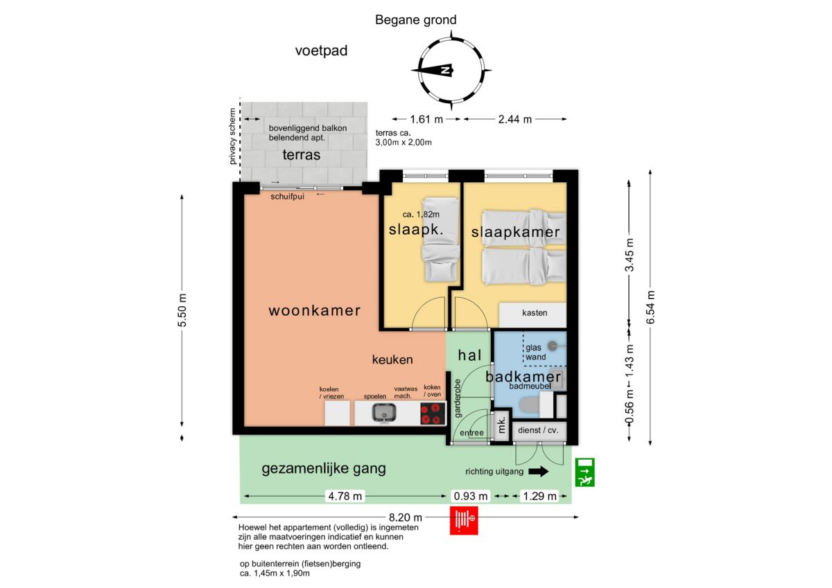 Indeling: Vanuit de hal bereikt u de badkamer, twee keurige slaapkamers en de lichte living met schuifpui naar het zonnige terras.