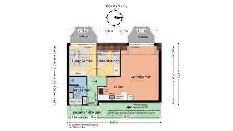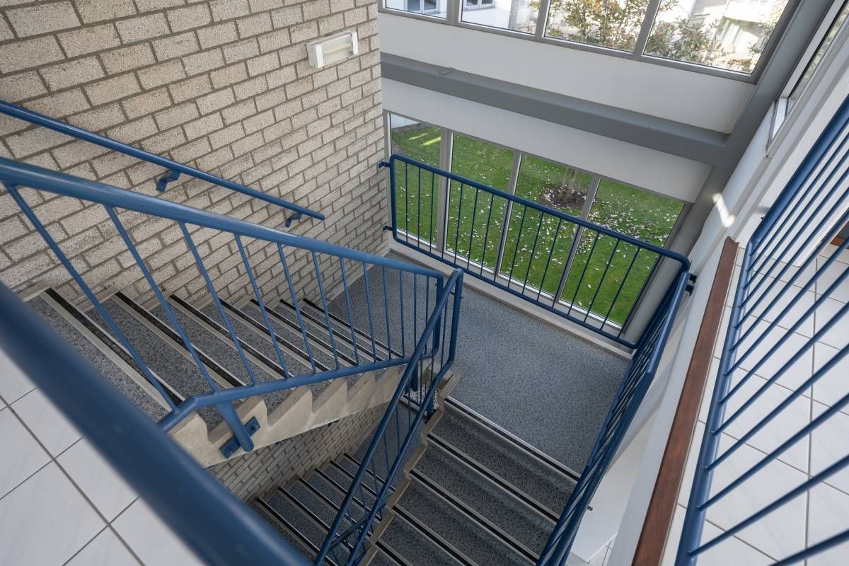 Het appartement bevindt zich op de tweede verdieping, beschikt over twee slaapkamers én twee balkons, en is zowel per trap als lift bereikbaar.
