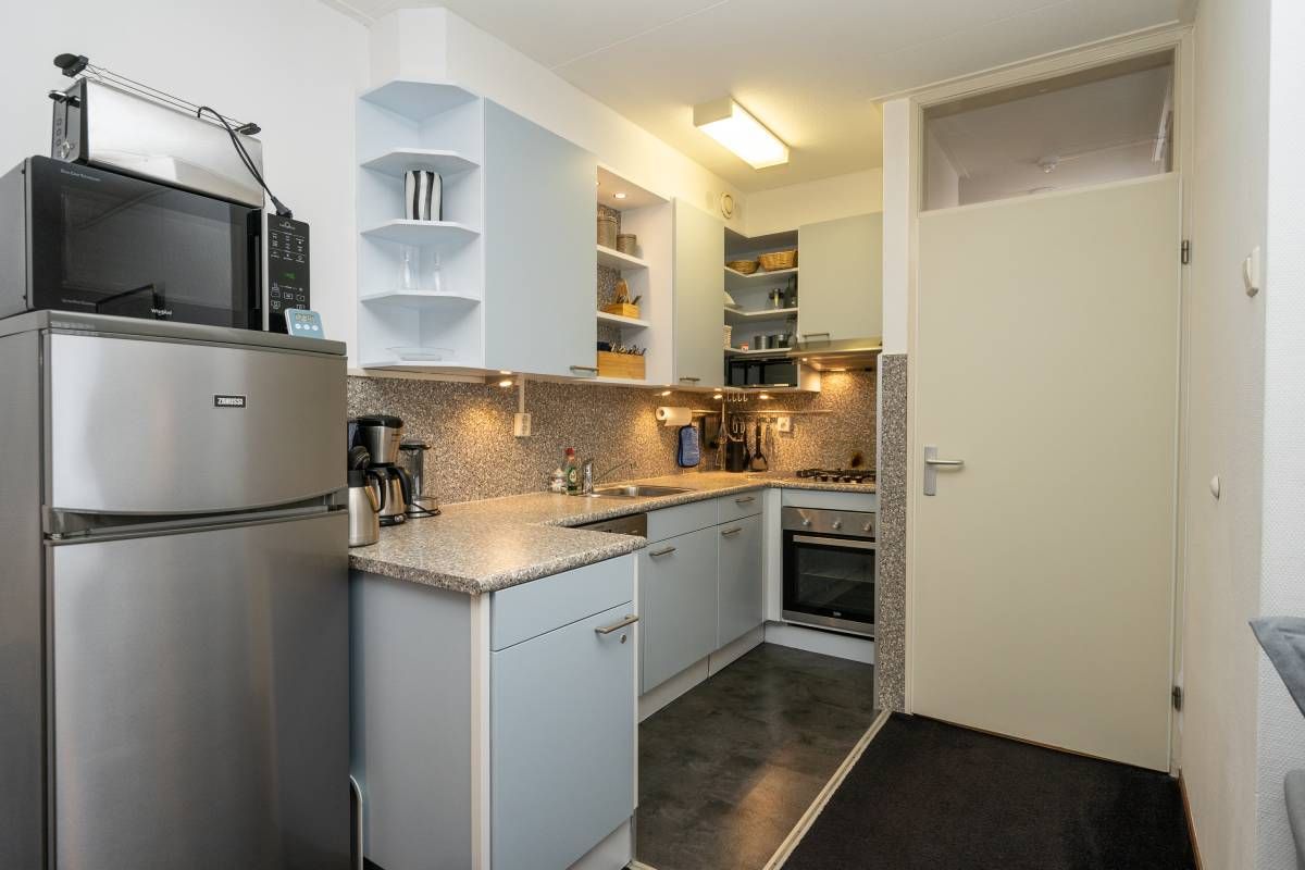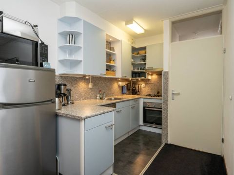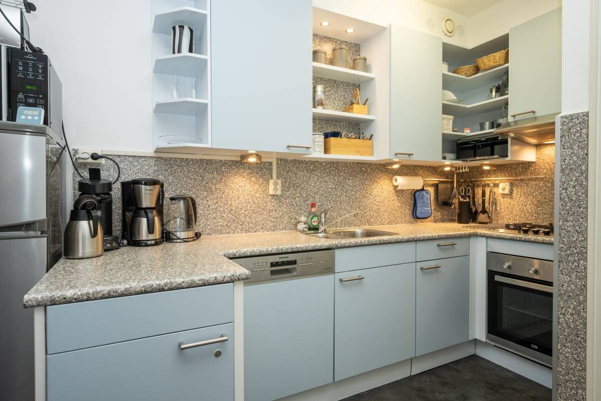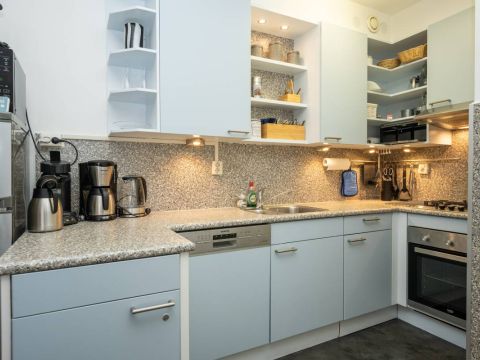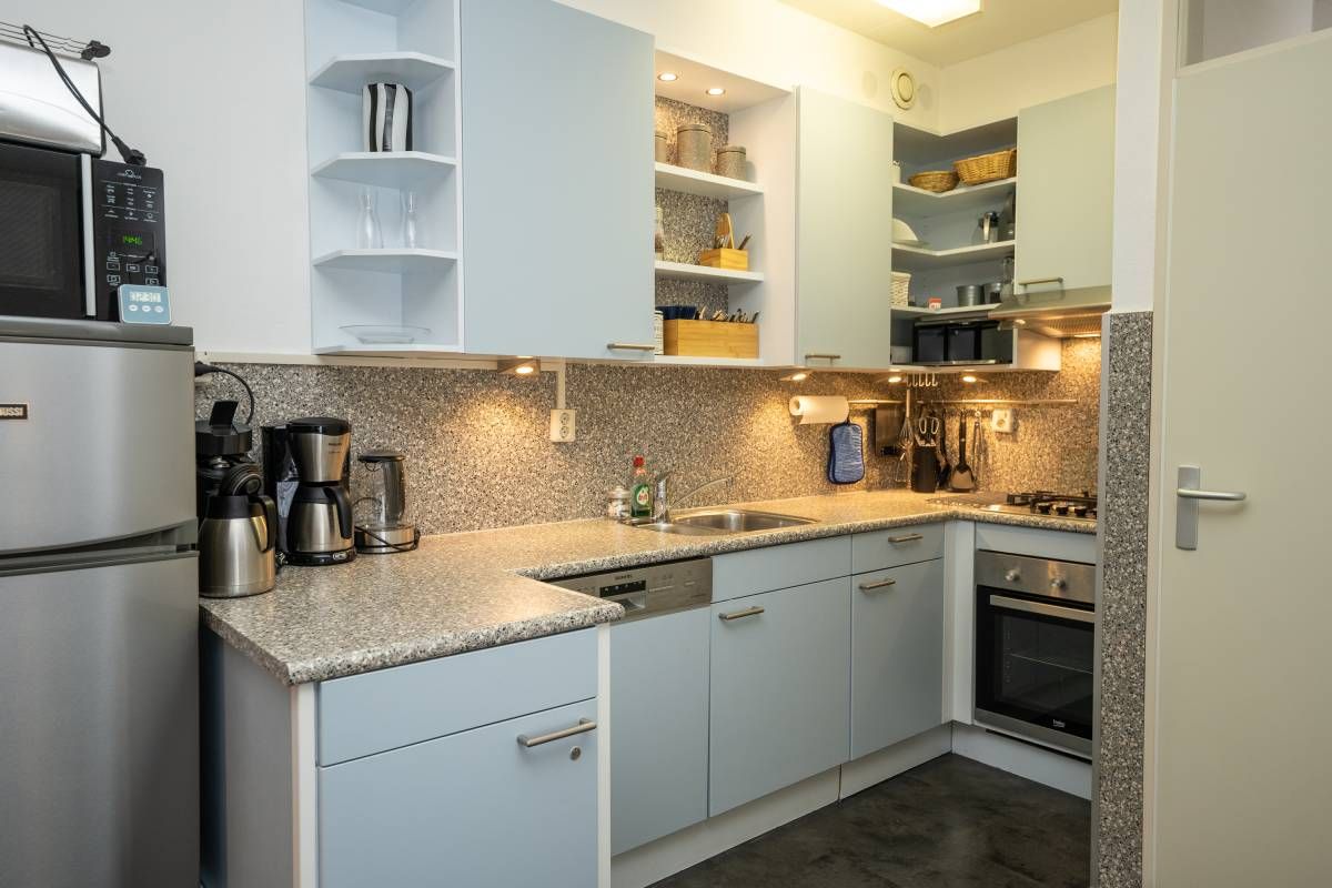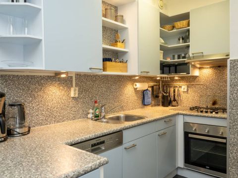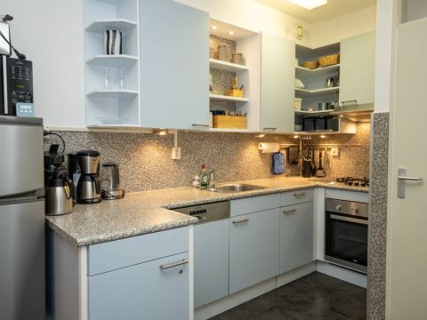 Aansluitend bevindt zich de verzorgde open keuken, uitgerust met diverse (inbouw)apparatuur, waaronder een gaskookstel, afzuigkap, vaatwasser en een losse koel vriescombinatie.