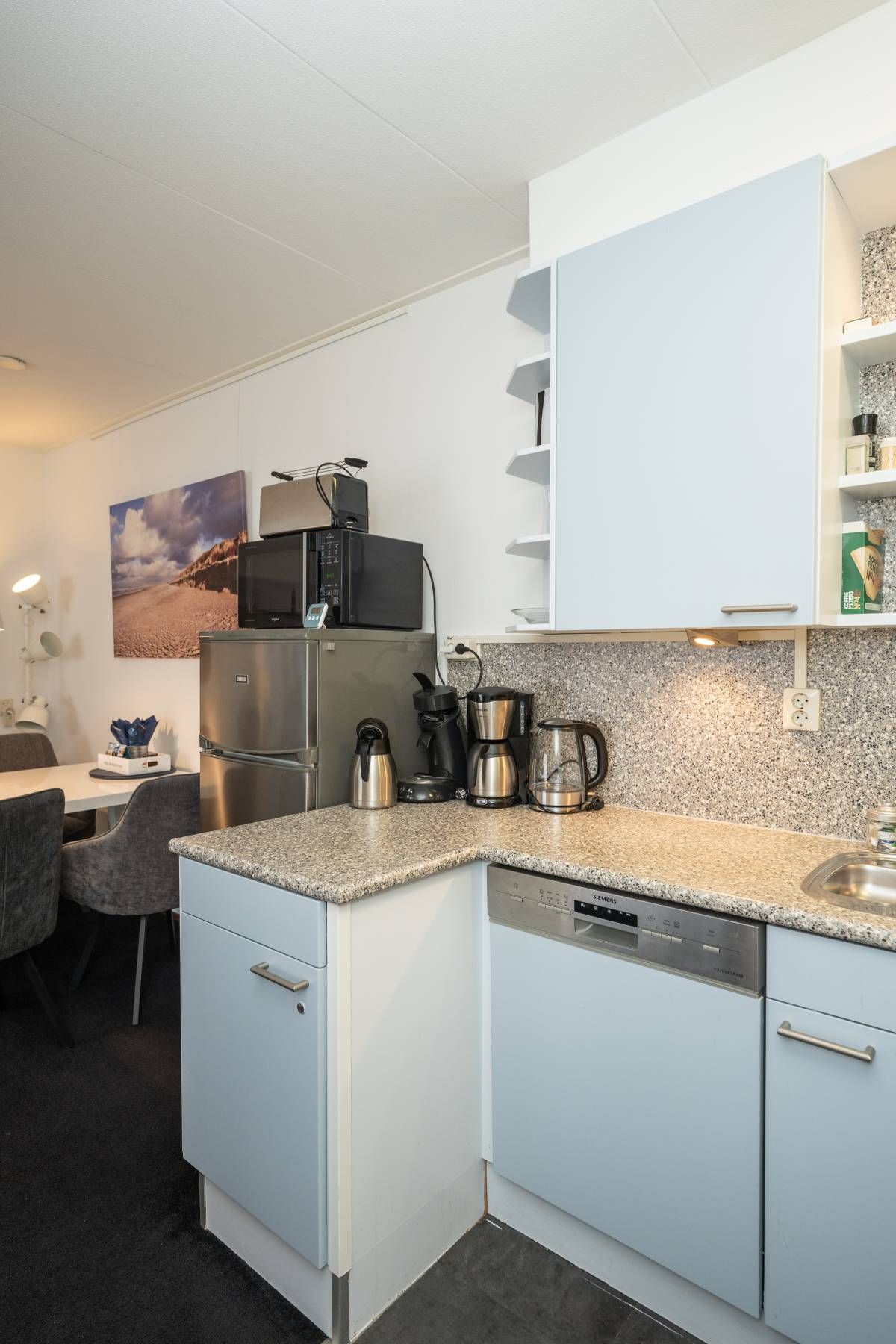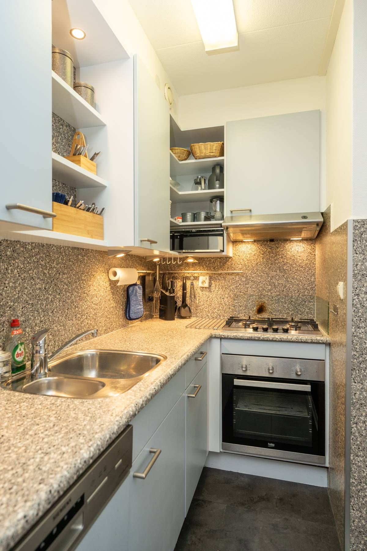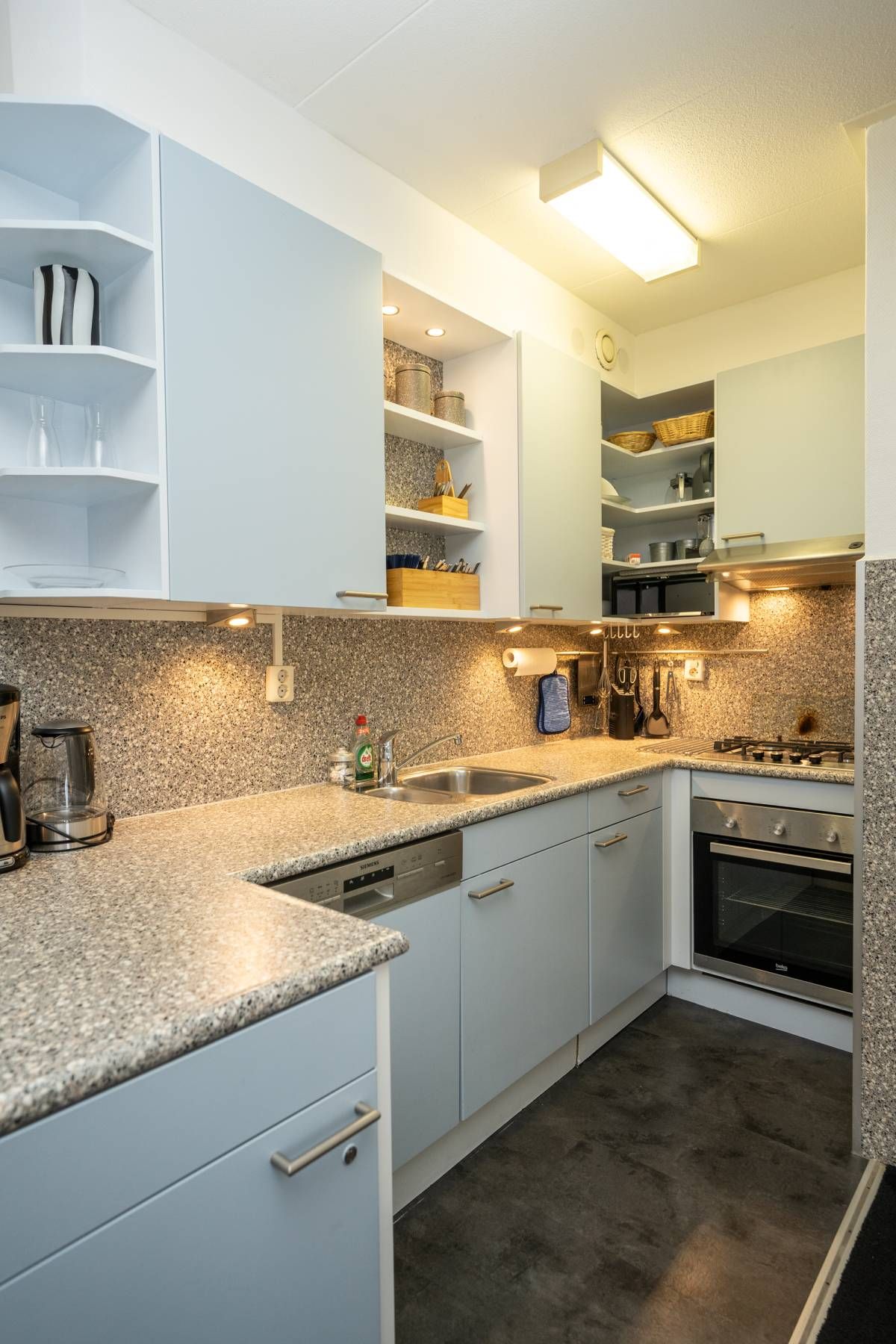 Aansluitend bevindt zich de verzorgde open keuken, uitgerust met diverse (inbouw)apparatuur, waaronder een gaskookstel, afzuigkap, vaatwasser en een losse koel vriescombinatie.