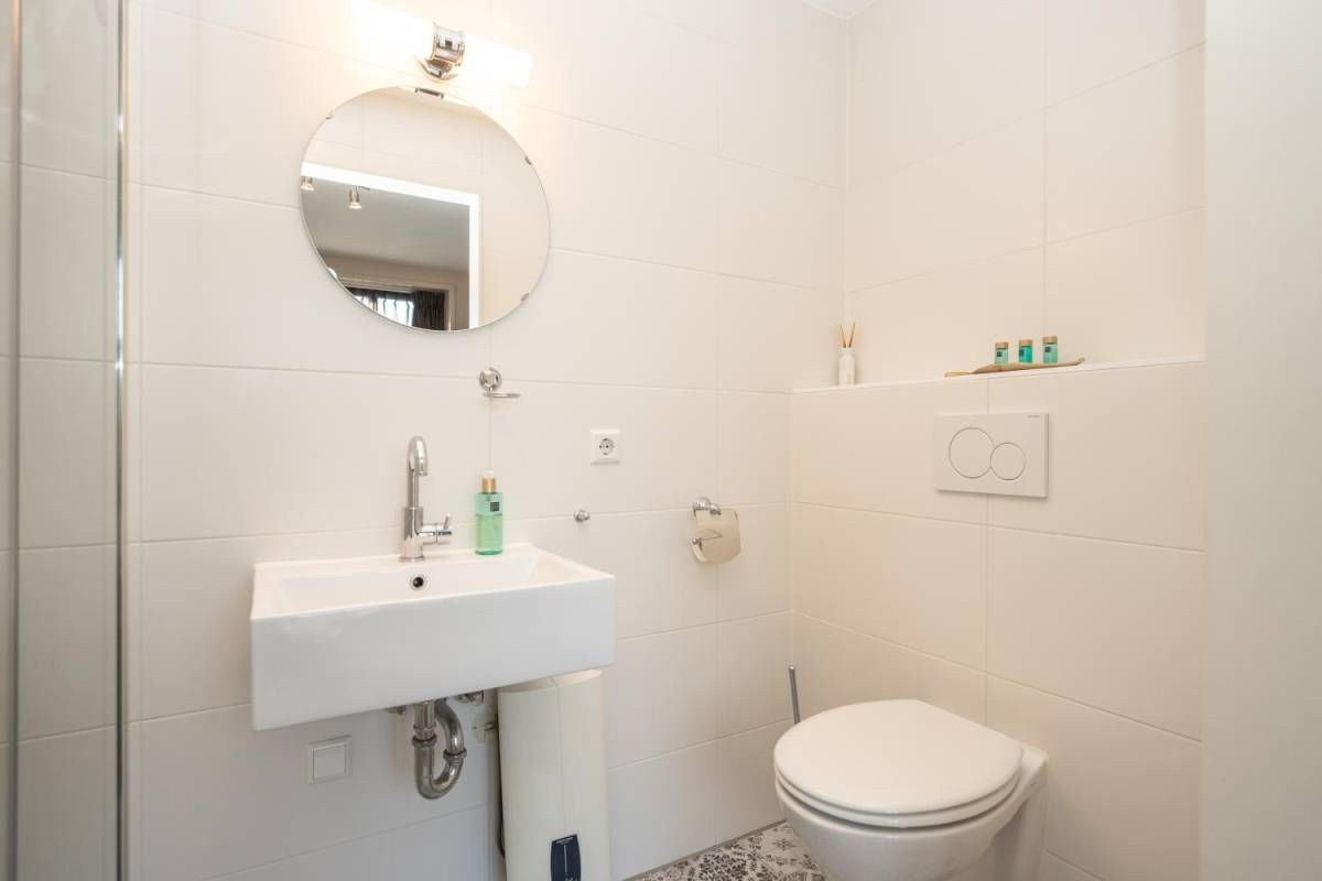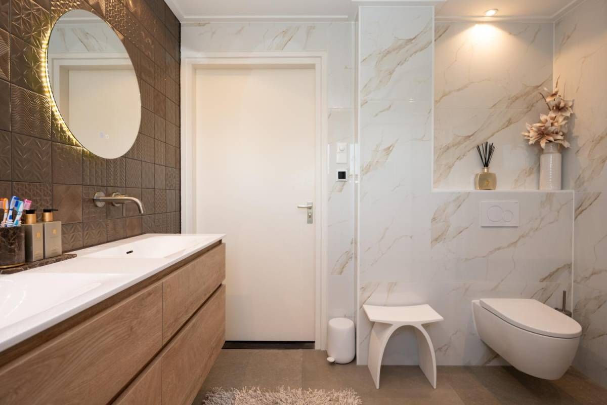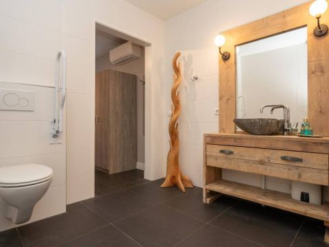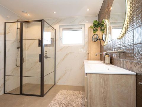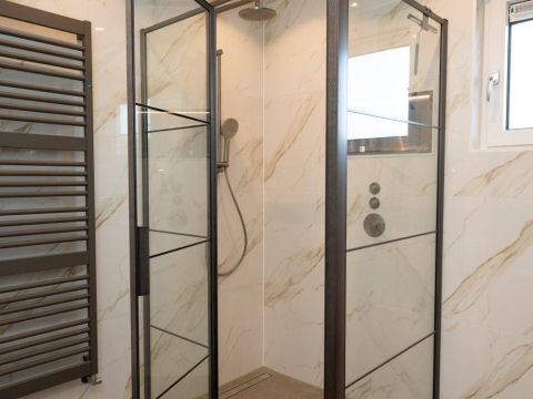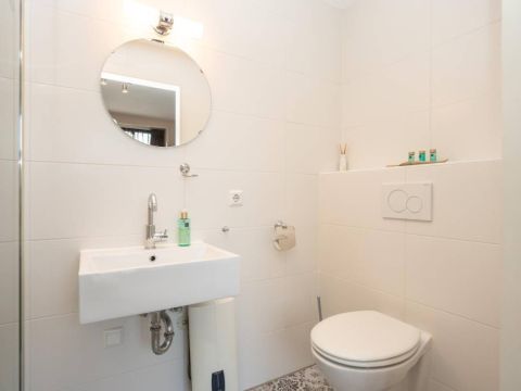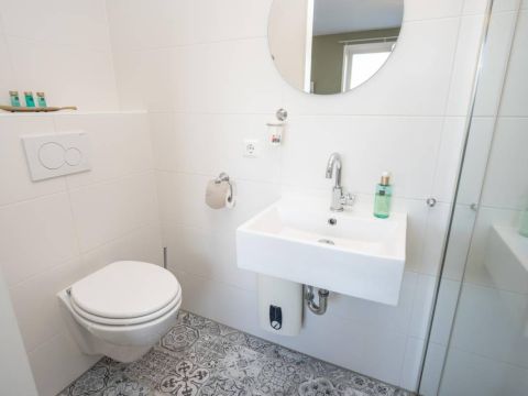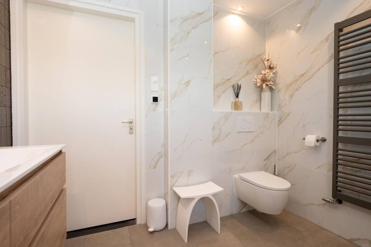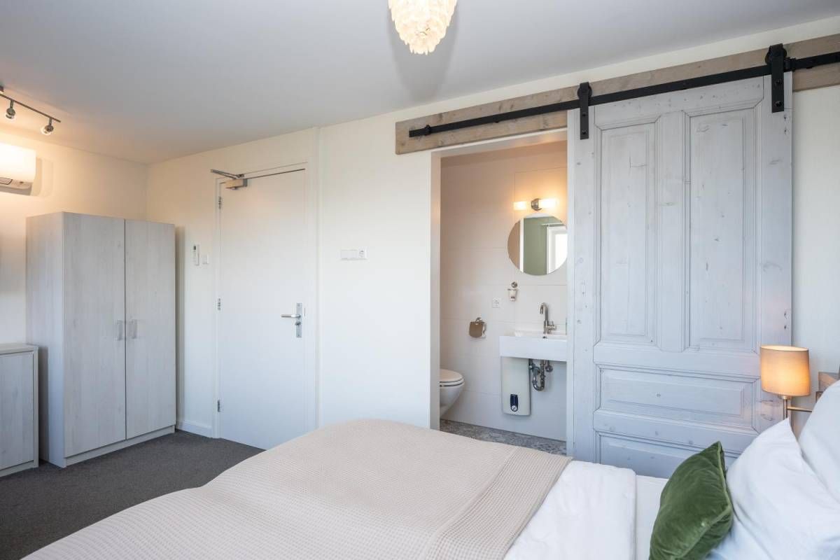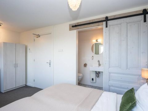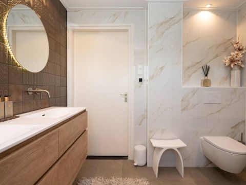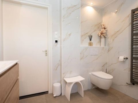 1 kamer wordt voor privé gebruikt (Master-bedroom) en maakt gebruik van de privé-badkamer, deze heeft het échte wauw-effect. De sfeer, de keurige afwerking en de rustige kleurencombinatie zorgen voor een prachtig geheel. De badkamer beschikt over een inloopdouche, een dubbel wastafelmeubel en een vrijhangend toilet (uiteraard met vloerverwarming).