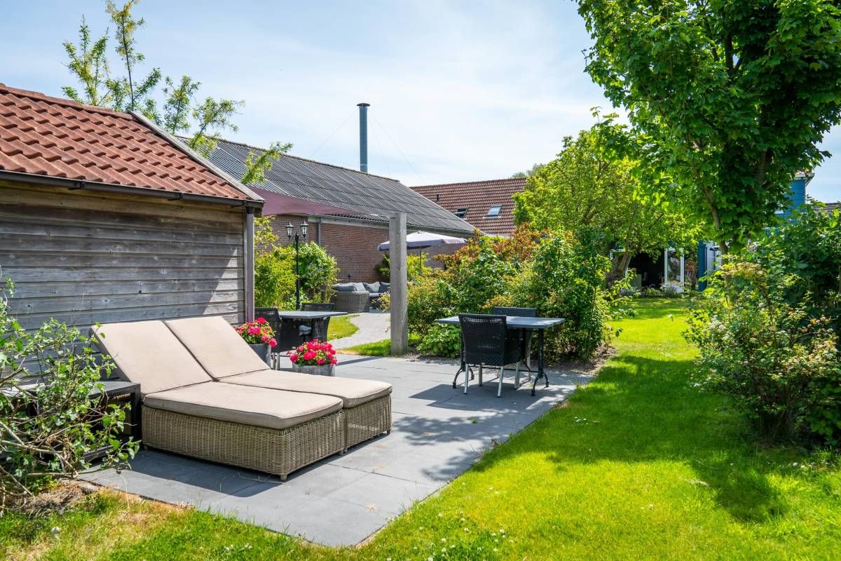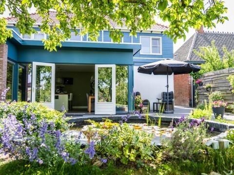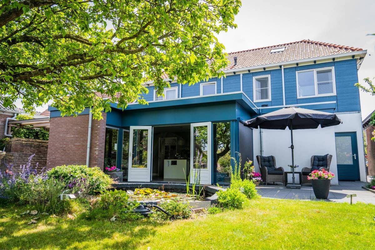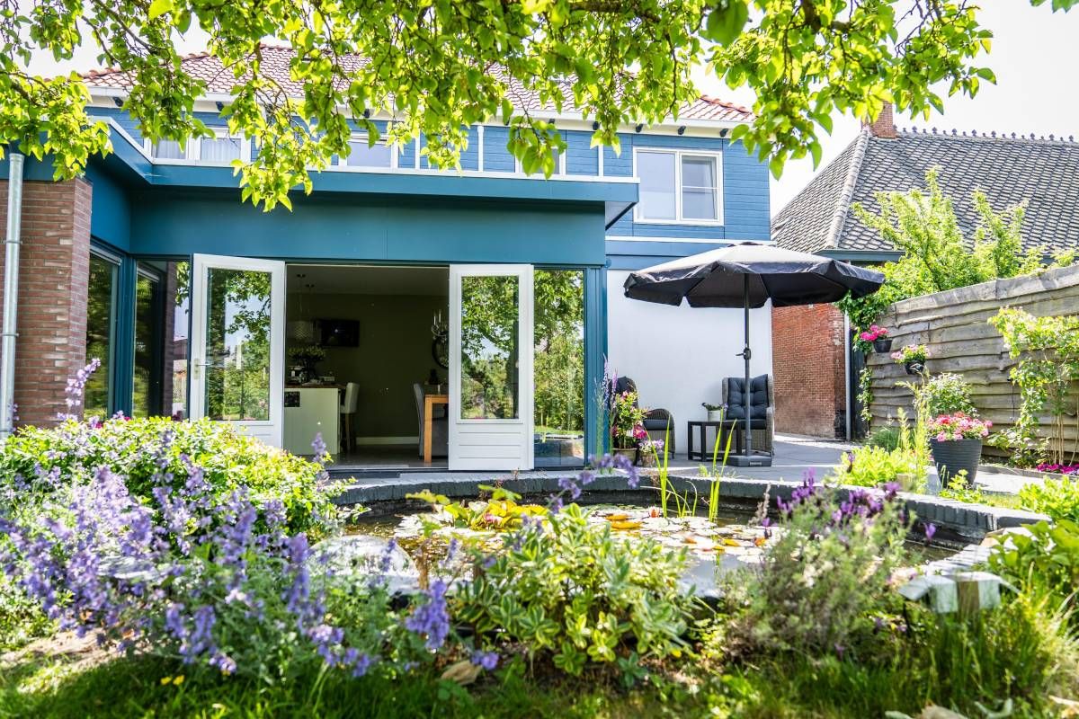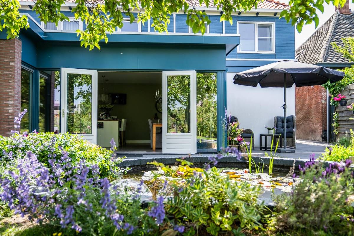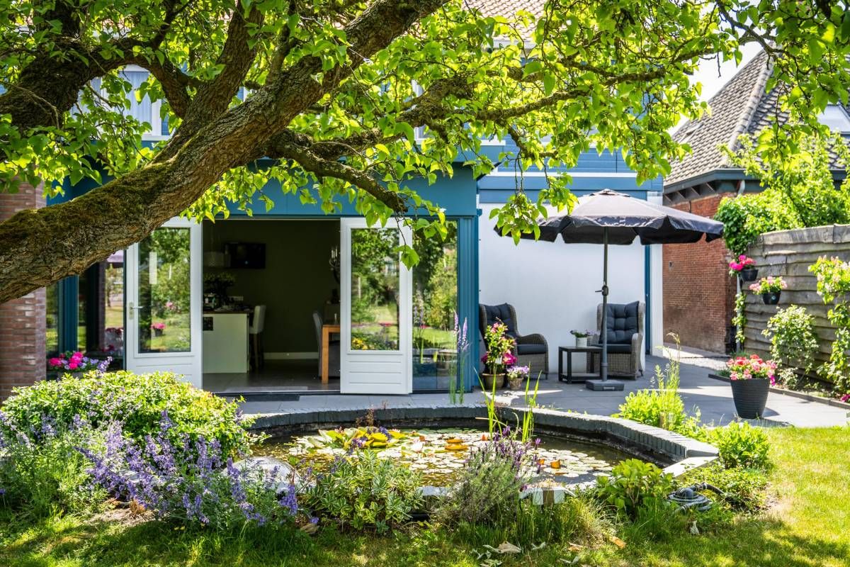 De bijna volglazen zij– en achterpui (met openslaande deuren) biedt een fantastisch rustgevend tuincontact.
