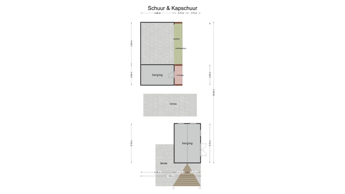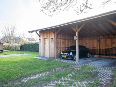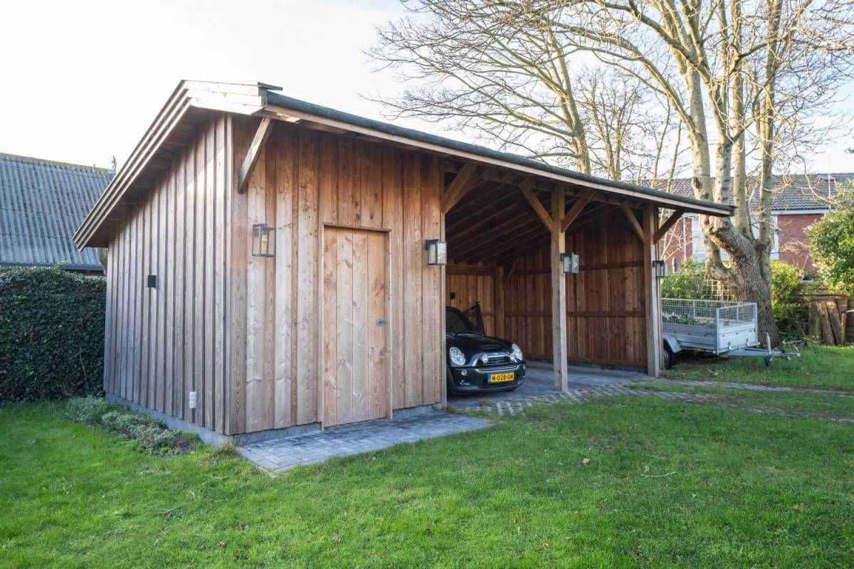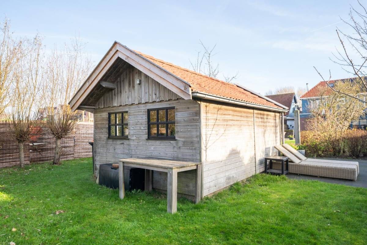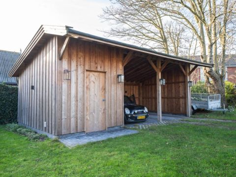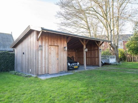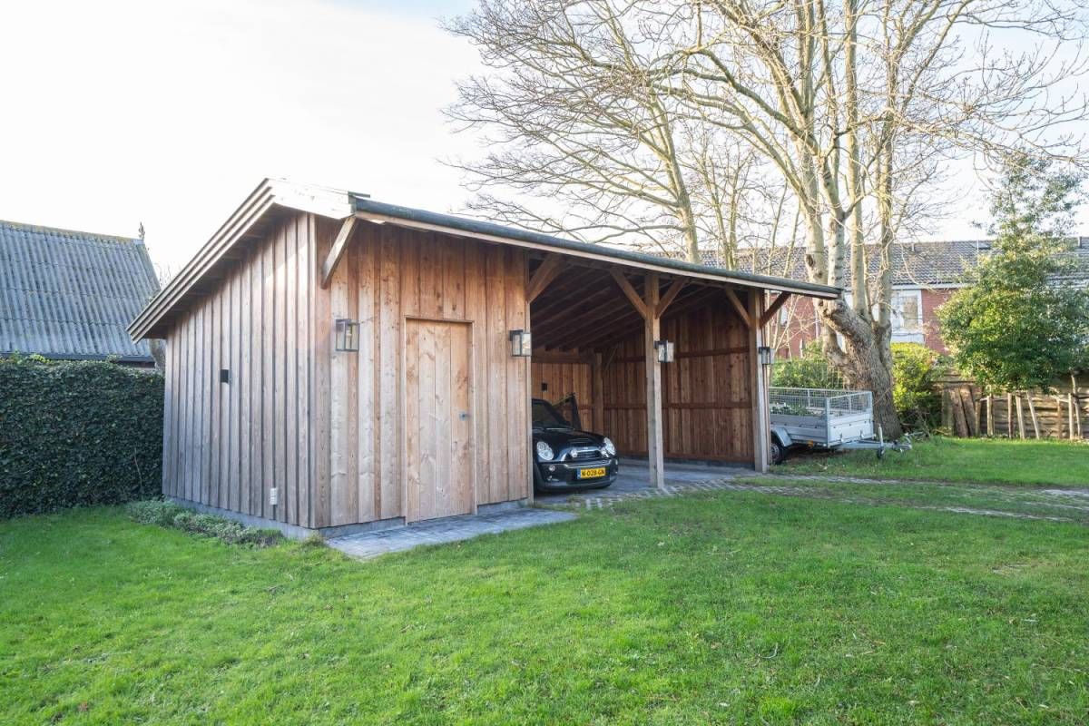 Midden in de tuin treft u een vrijstaande berging aan voor het opbergen van uw tuin-meubelen en of materialen. Achter in de tuin is een nieuwe schuur gerealiseerd met een overkapping voor uw auto(‘s).