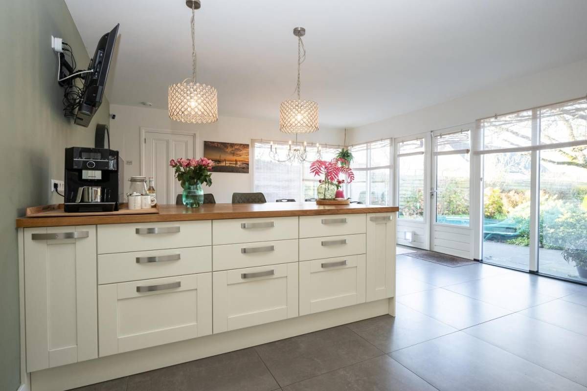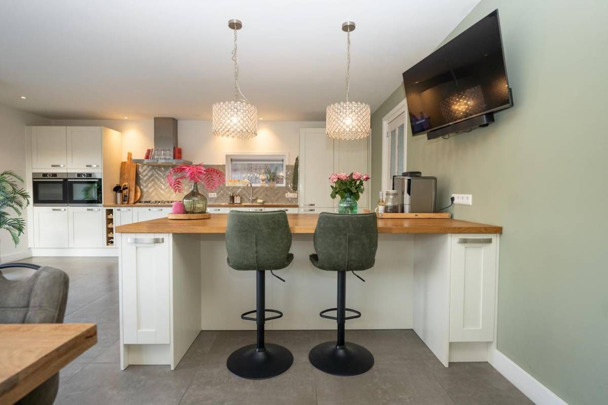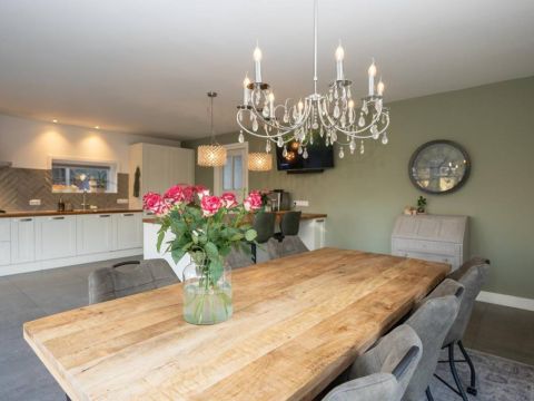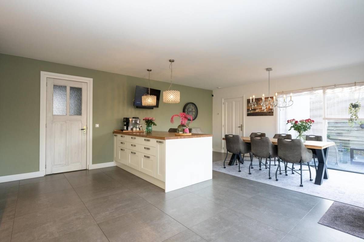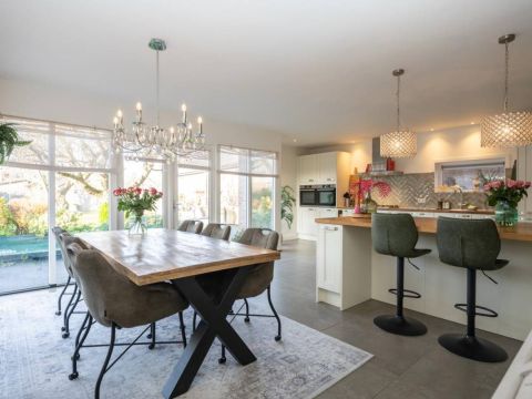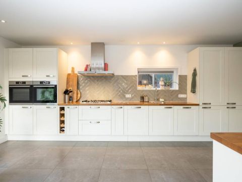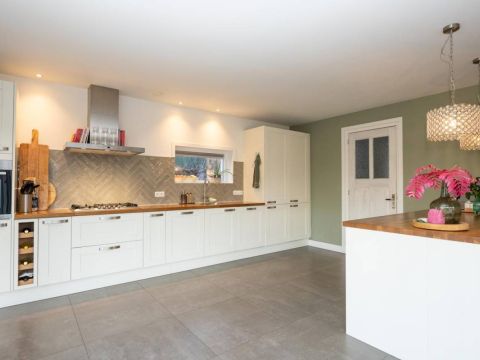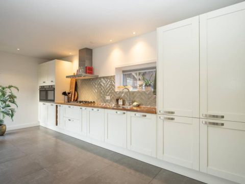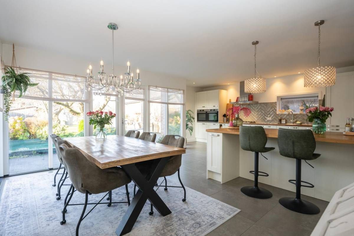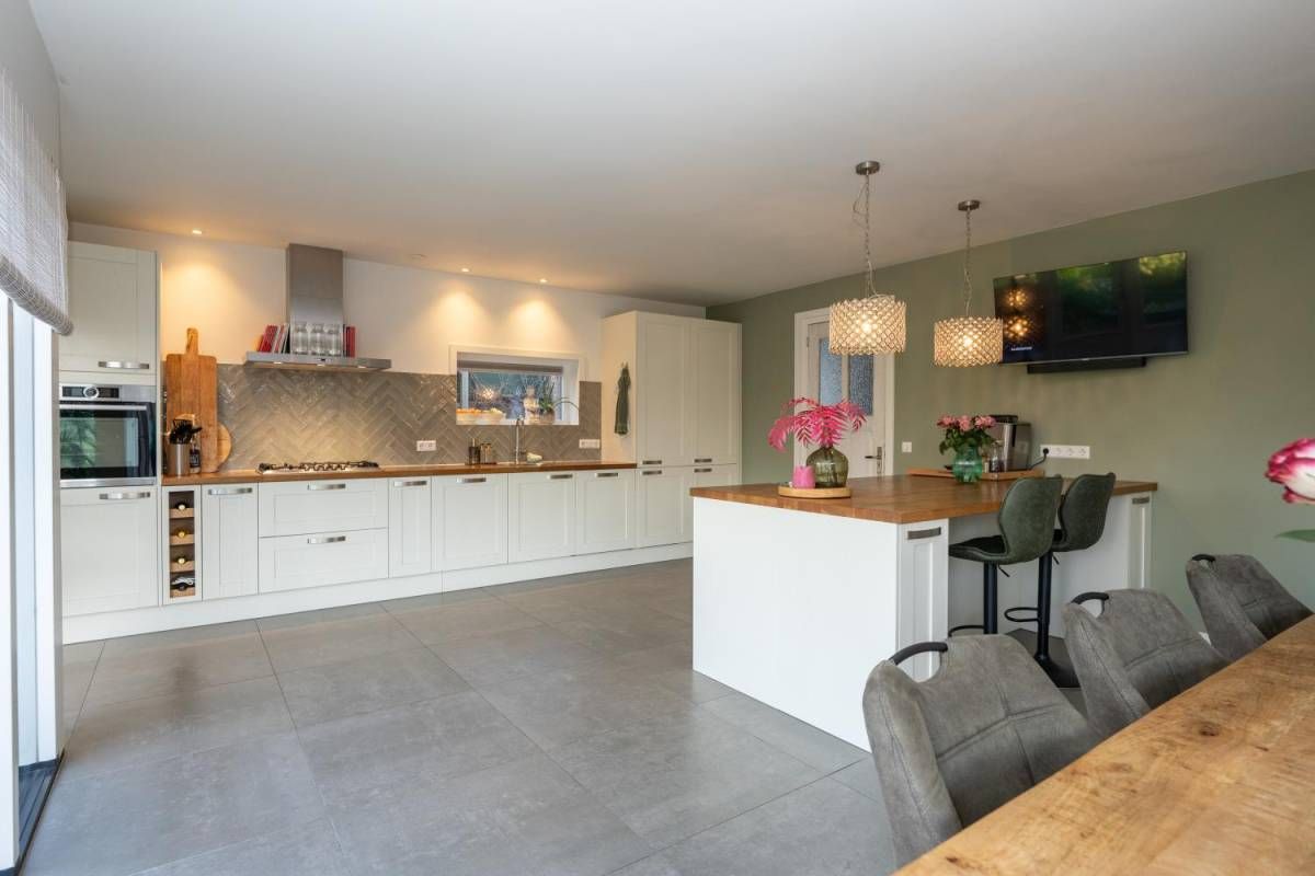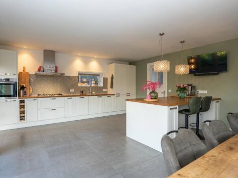 De royale en moderne woonkeuken is voorzien van hoogwaardige inbouwapparatuur zoals een moderne kookplaat, oven, combi-oven, vaatwasser, koelkast, vrieskast en een Quooker. Het slimme gebruik van opbergruimte zorgt ervoor dat alle benodigdheden netjes kunnen worden opgeborgen. Of u nu een culinaire maaltijd bereidt of gezellig met familie en vrienden dineert, deze woonkeuken biedt de ideale setting. Kortom, deze woonkeuken is de ideale plek voor koken, eten en samen zijn, met alle luxe die u zich kunt wensen.