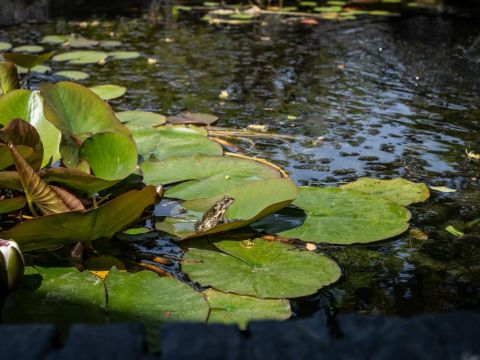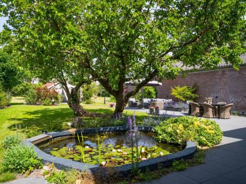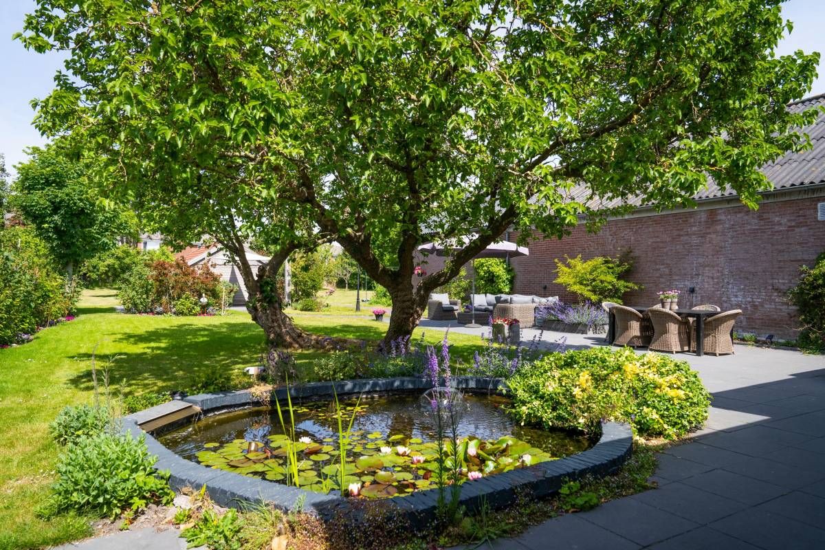 De tuin achter het huis is voorzien van meerdere terrasjes, een imposante vijverpartij, een tuinhuis, fraaie beplanting en (uiteraard) de stokoude moerbeiboom.