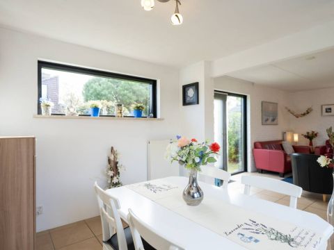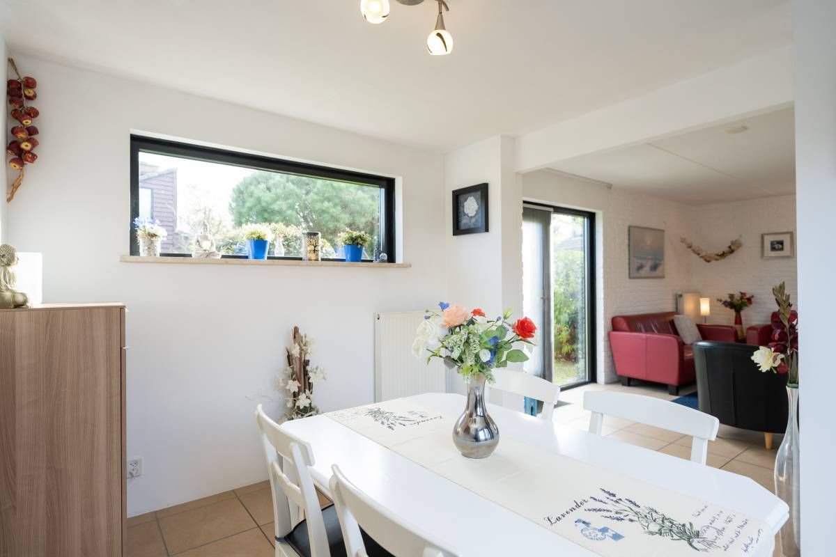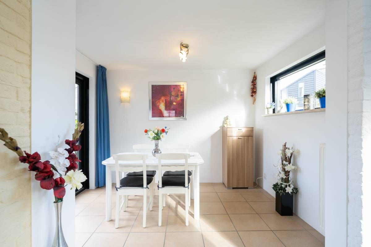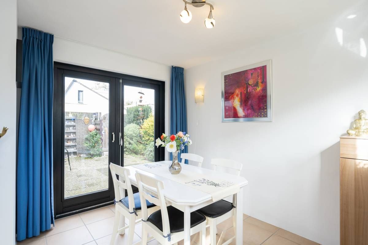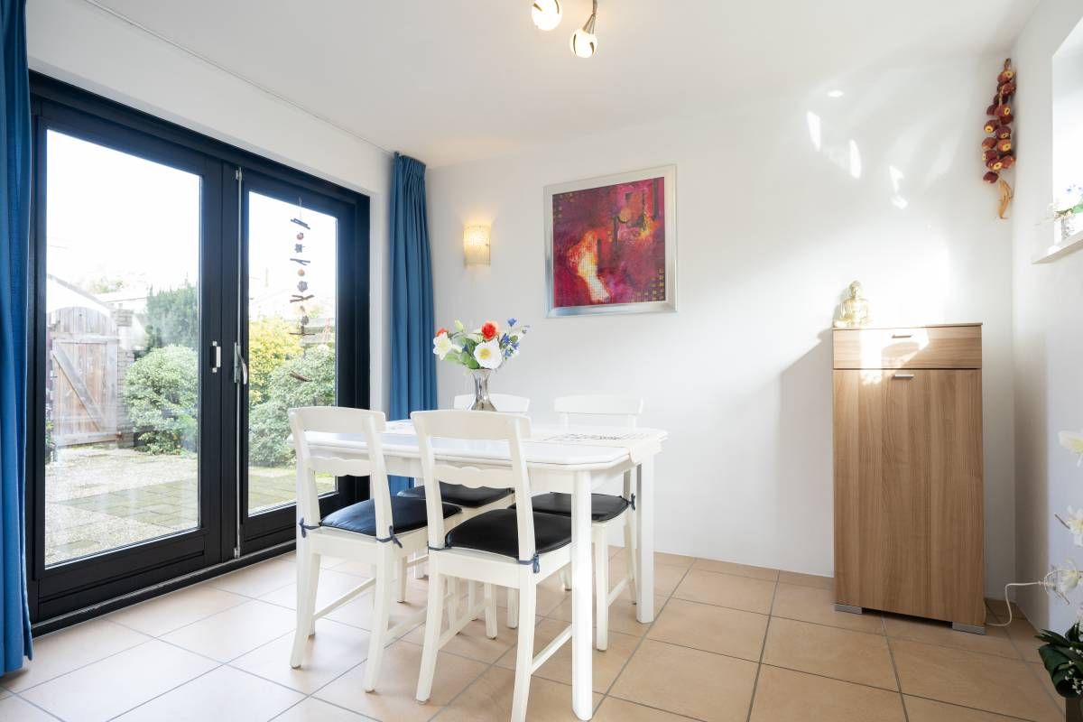 In de uitbouw is een eethoek gecreëerd met openslaande deuren naar het terras, waardoor binnen en buiten naadloos in elkaar overlopen. Dankzij de grote ramen en prettige lichtinval is dit een sfeervolle plek om te ontspannen.