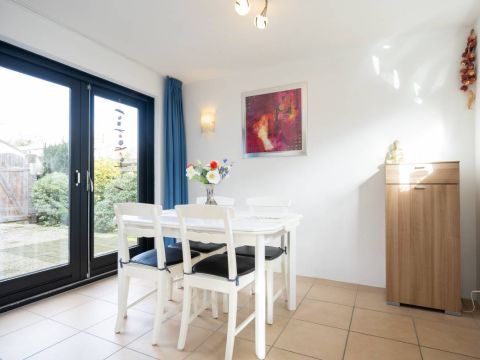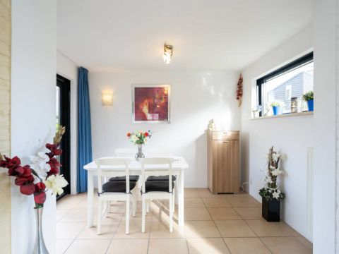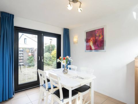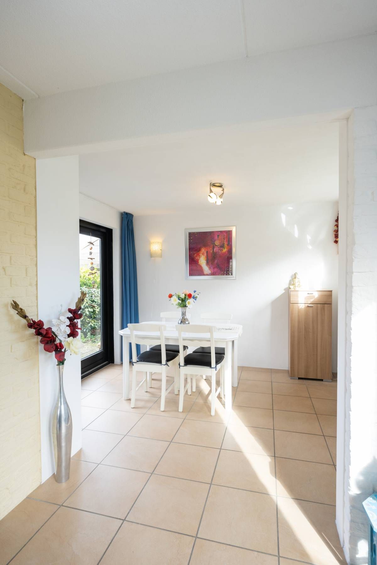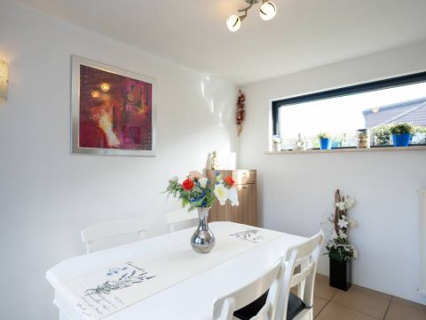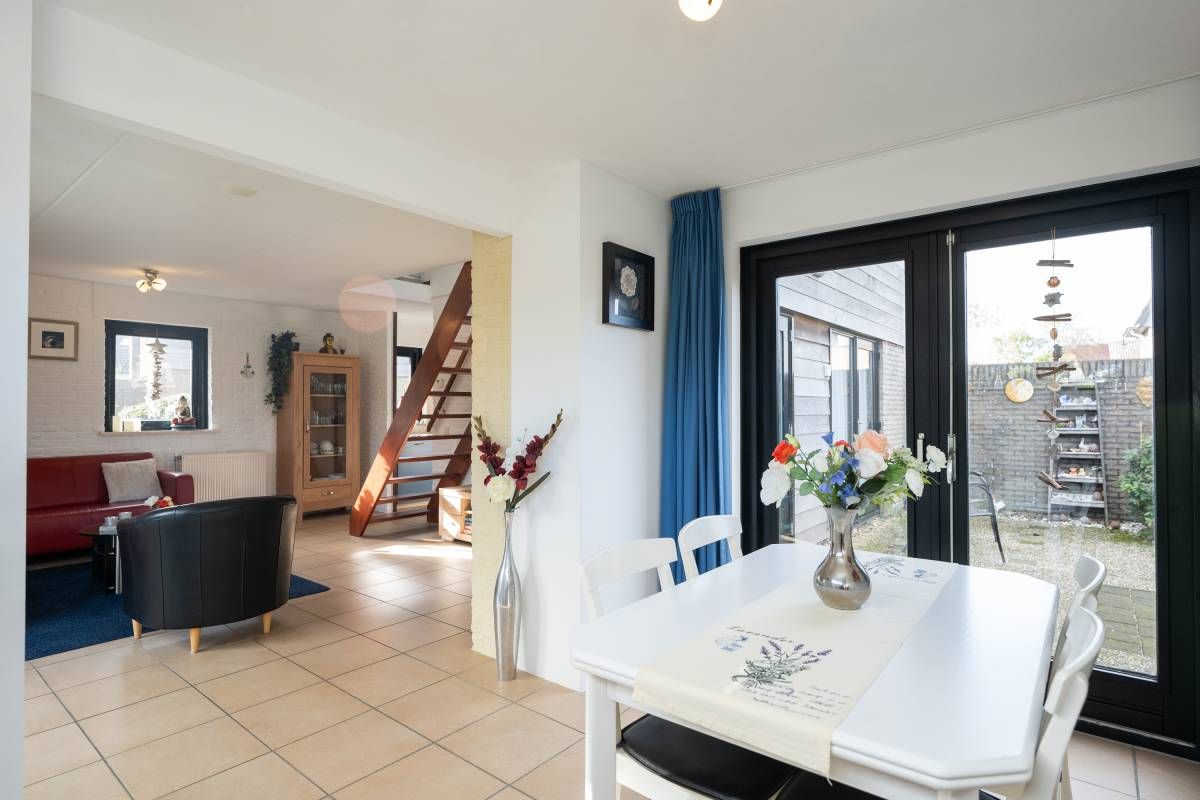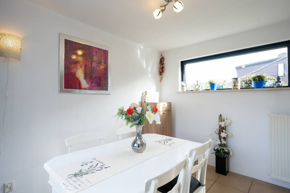 In de uitbouw is een eethoek gecreëerd met openslaande deuren naar het terras, waardoor binnen en buiten naadloos in elkaar overlopen. Dankzij de grote ramen en prettige lichtinval is dit een sfeervolle plek om te ontspannen.