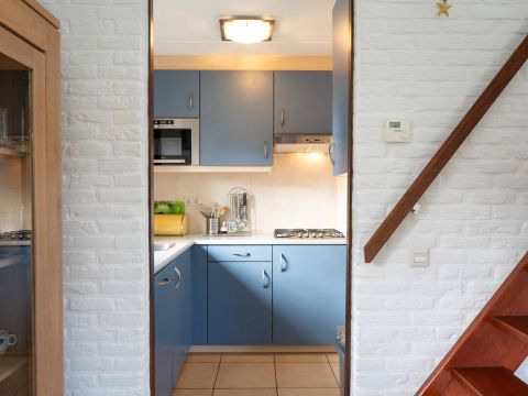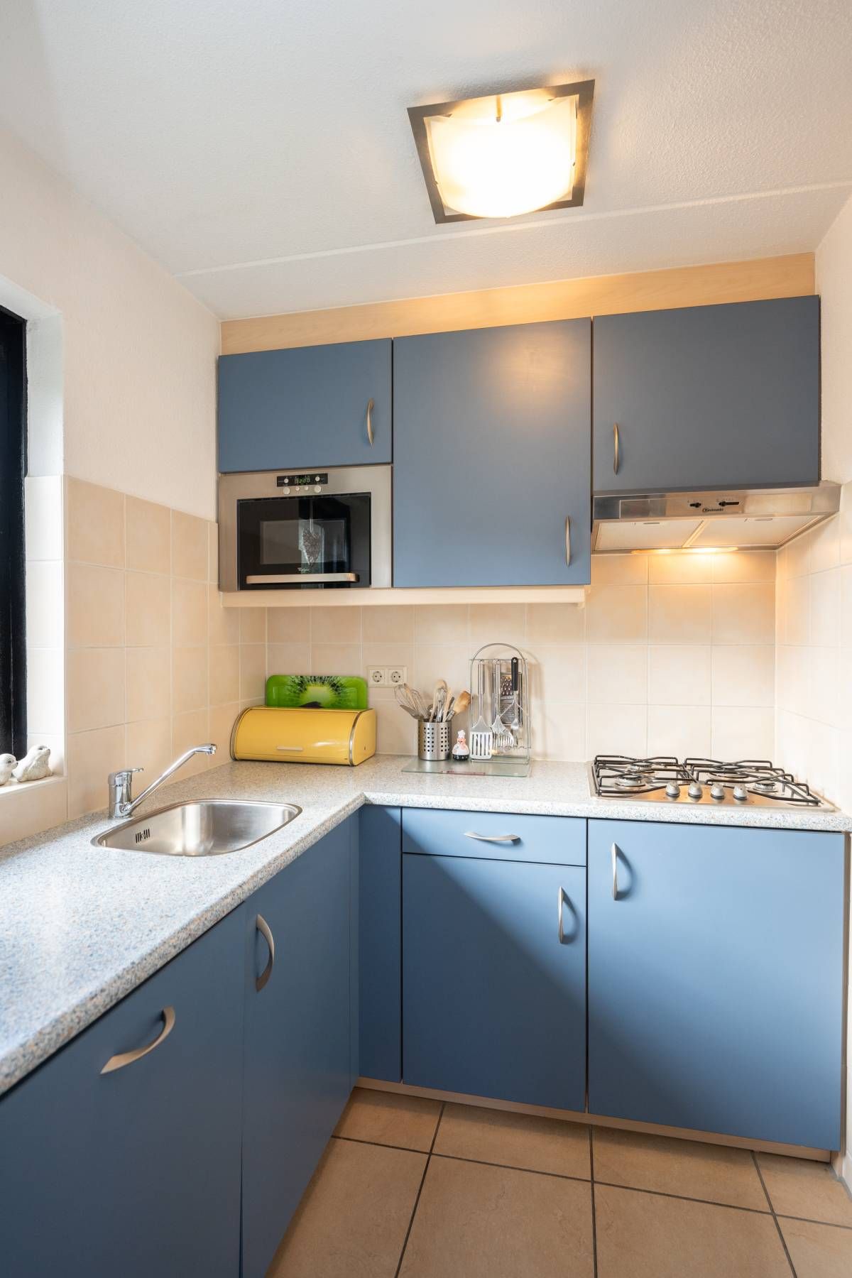 Aansluitend bevindt zich de praktische en goed uitgeruste keuken, voorzien van diverse apparatuur, waaronder een gaskookplaat, afzuigkap en vaatwasser.