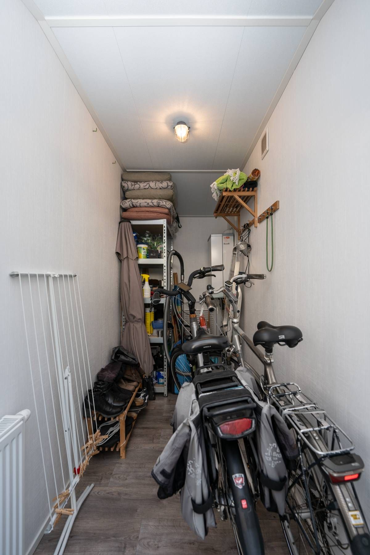 De berging is buitenom bereikbaar. Hier treft u de aansluitingen voor de wasmachine en droger, de opstelplaats van de cv-ketel én voldoende ruimte voor fietsen of extra opslag. Perfect om alle strandspullen, buitenmeubilair of voorraad op te slaan.