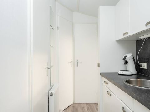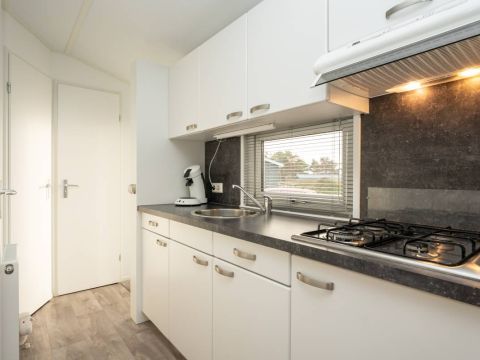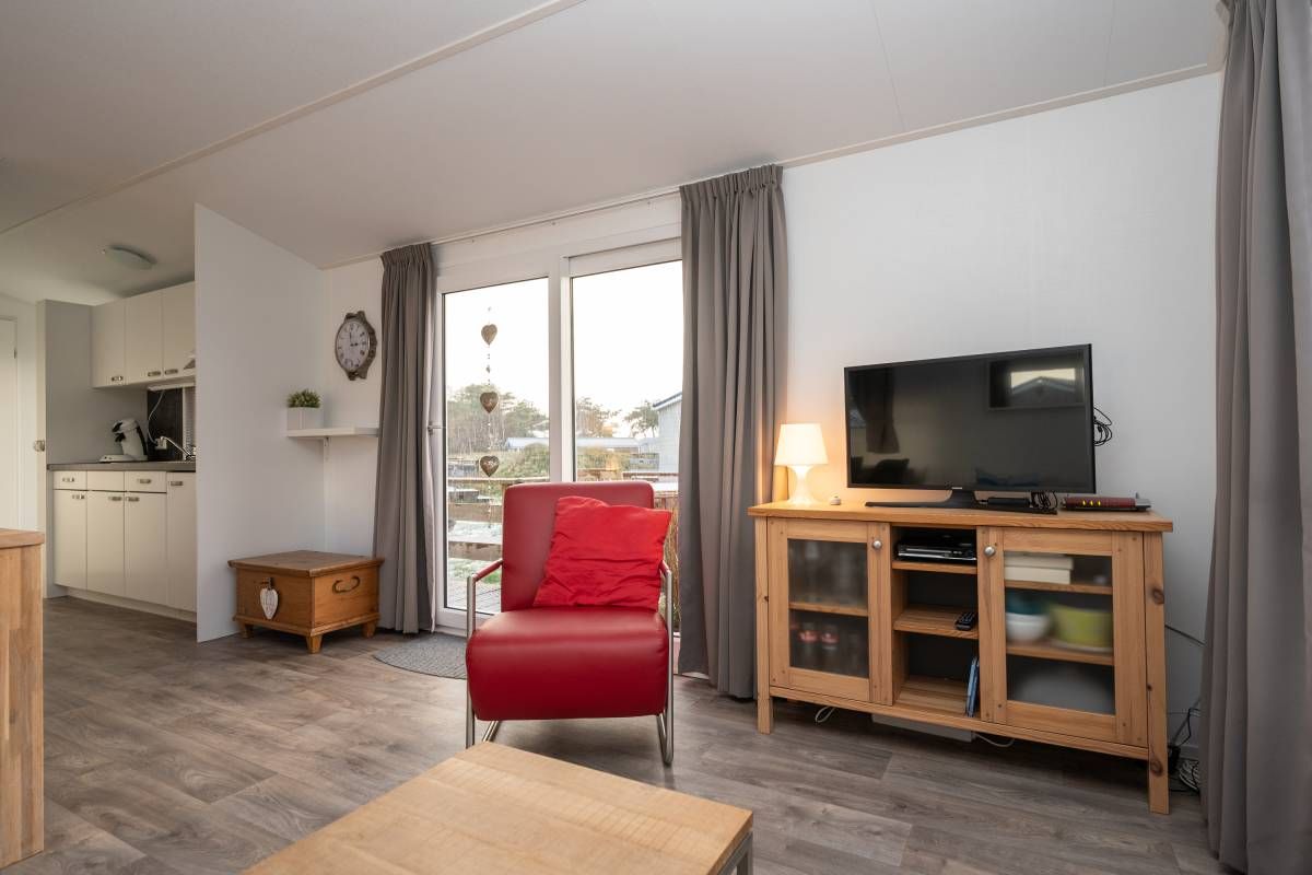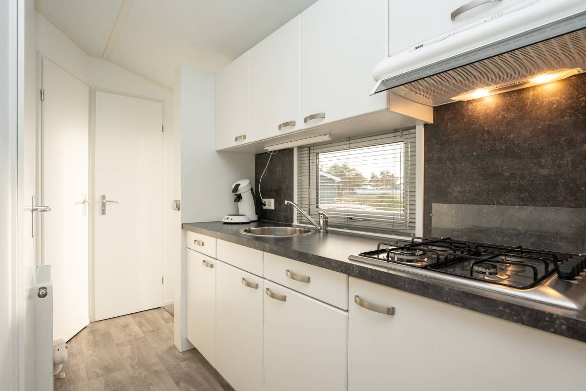 De woonkamer staat in open verbinding met de moderne keuken. Deze is praktisch ingedeeld en voorzien van diverse voorzieningen die je van een comfortabel chalet mag verwachten, met voldoende werk- en opbergruimte. Een fijne plek om een ontbijt te bereiden of uitgebreid te koken.