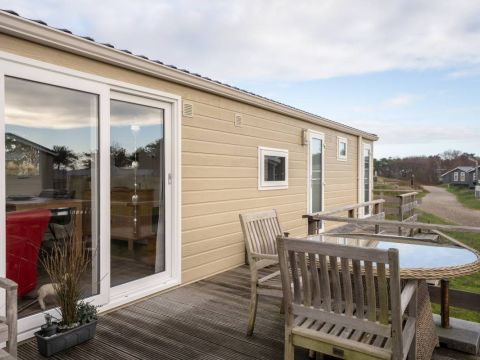 Voor het chalet vindt u een riant terras waar u heerlijk kunt genieten van het buitenleven.