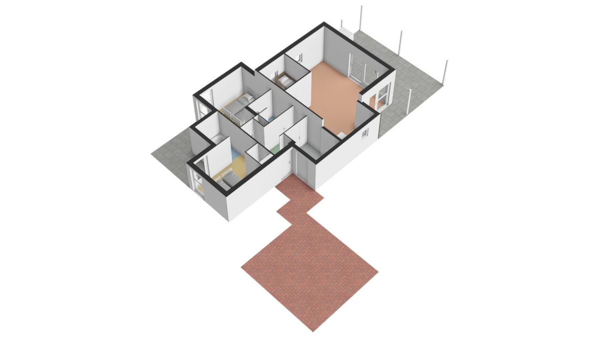 U komt de woning binnen via de rechterzijde, waar zich de hal/entree bevindt. Via de hal toegang tot de living, twee slaapkamers, badkamer, toilet en berging.