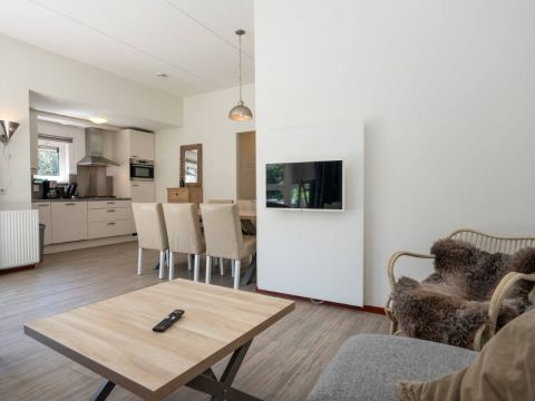 De living beschikt over een sfeervolle zit– en eethoek. Middels de openslaande deuren betreed u het beschutte terras.
